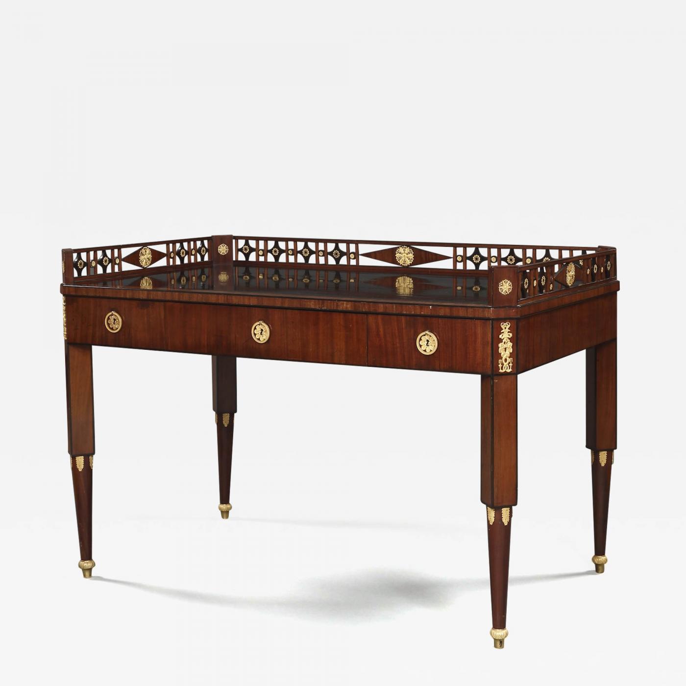 Of mahogany with ebony inlay and finely worked gilt bronze mounts. The rectangular top with canted corners with conforming pierced three quarter gallery, the gallery of alternating quatreform and circular panels set to each side with gilt mounts of alternate stylized pierced vine roundel and foliate paterae, the canted panels set with leaf form star with berry springs, the gallery centered to each side with lozenge panel set with stylized leaf form gilt bronze mount in shape of a star, the top above a conforming frieze set to the front and reverse with three drawers centered by foliate escutcheons (one replaced) issuing ring handles, the canted corners set with gilt mounts of half figures entwined around a cornucopia, the table set on four canted square legs with ebony stringing, tapering and circular from the knee with gilt bronze foliate mounts, the legs set on gilt feet with foliate decoration. One escutcheon replaced.