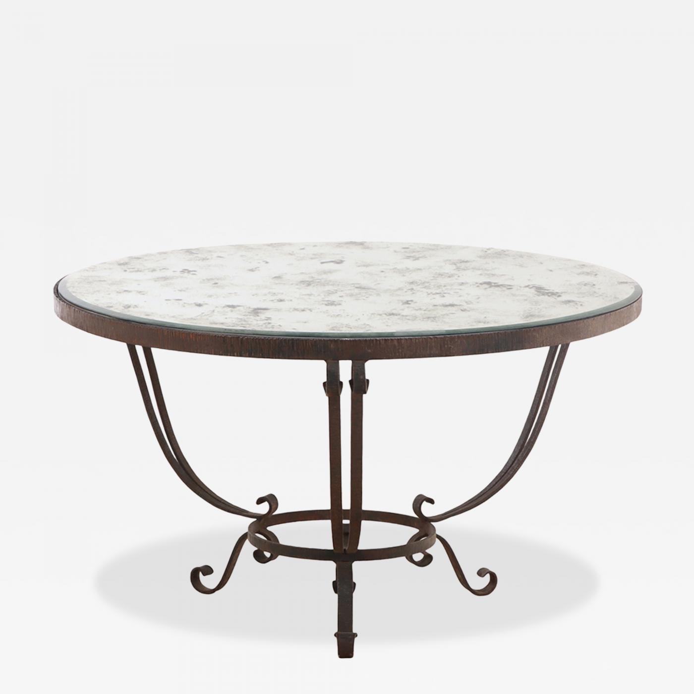 Striking French round occasional table from the Art Deco period, featuring a hand-hammered iron frame and a reflective mirror top. The lovely scrolling base lines and metallic finish capture the elegance of 1940s design, making it a stylish accent piece for any interior.
