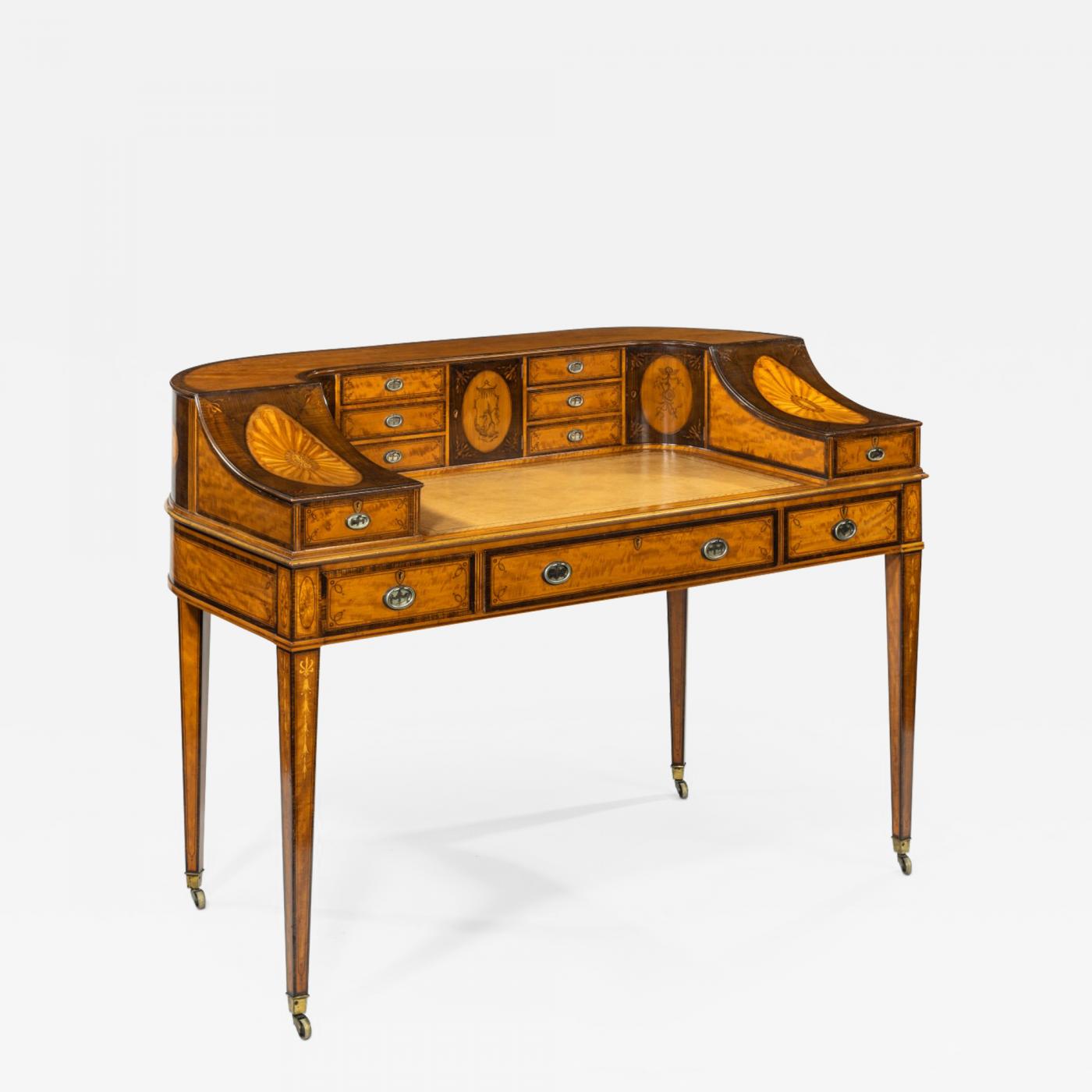 A late Victorian freestanding satinwood Carlton House desk, the curved rectangular top with the typical arrangement of six small drawers and a central cupboard around three sides, enclosing a leathered writing surface, sloping downwards to the front, decorated back and front with oval panels of radiating petals reserved on a dark harewood ground, the frieze with one long and two short drawers, all set upon square section tapering legs. English, circa 1880.