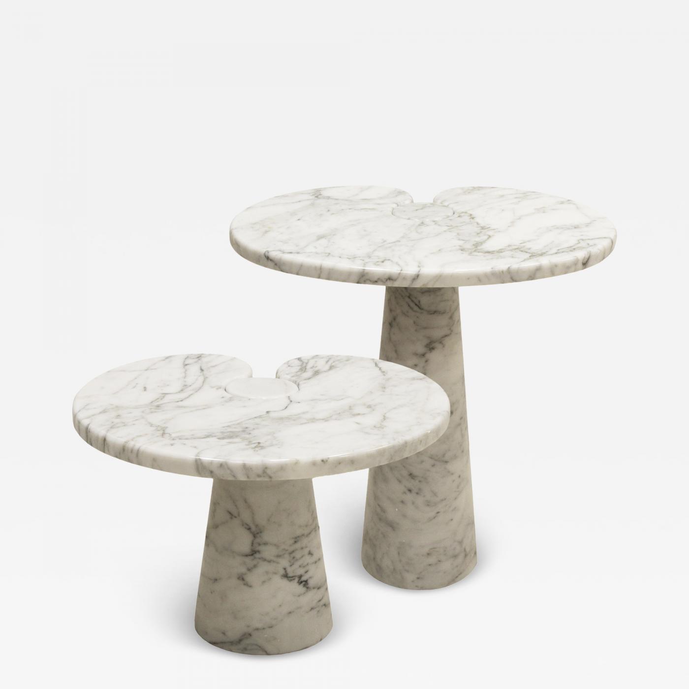 Pair of side tables in Carrara marble designed by Angelo Mangiarotti. This pair of marble side tables belongs to the Eros collection. Eros They belong to the Eros collection that he designed for Skipper, Italy in the 70s. Eros refers to the male-female coupling of the table top and leg.