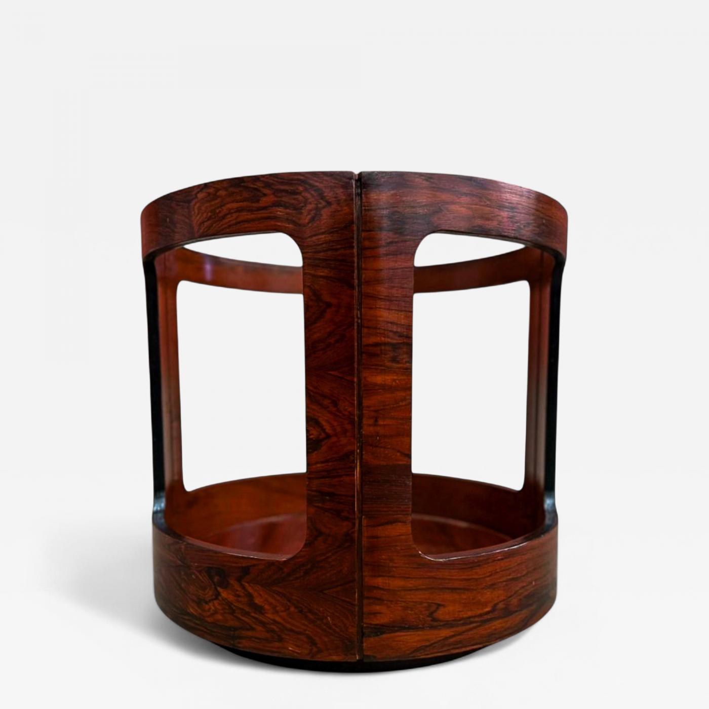 This sculptural rosewood side table, attributed to Bertomeu and crafted in the 1950s to 1960s. The cylindrical form is defined by four open, curved panels that highlight the rich grain and depth of the solid rosewood, giving the piece both visual lightness and architectural presence.