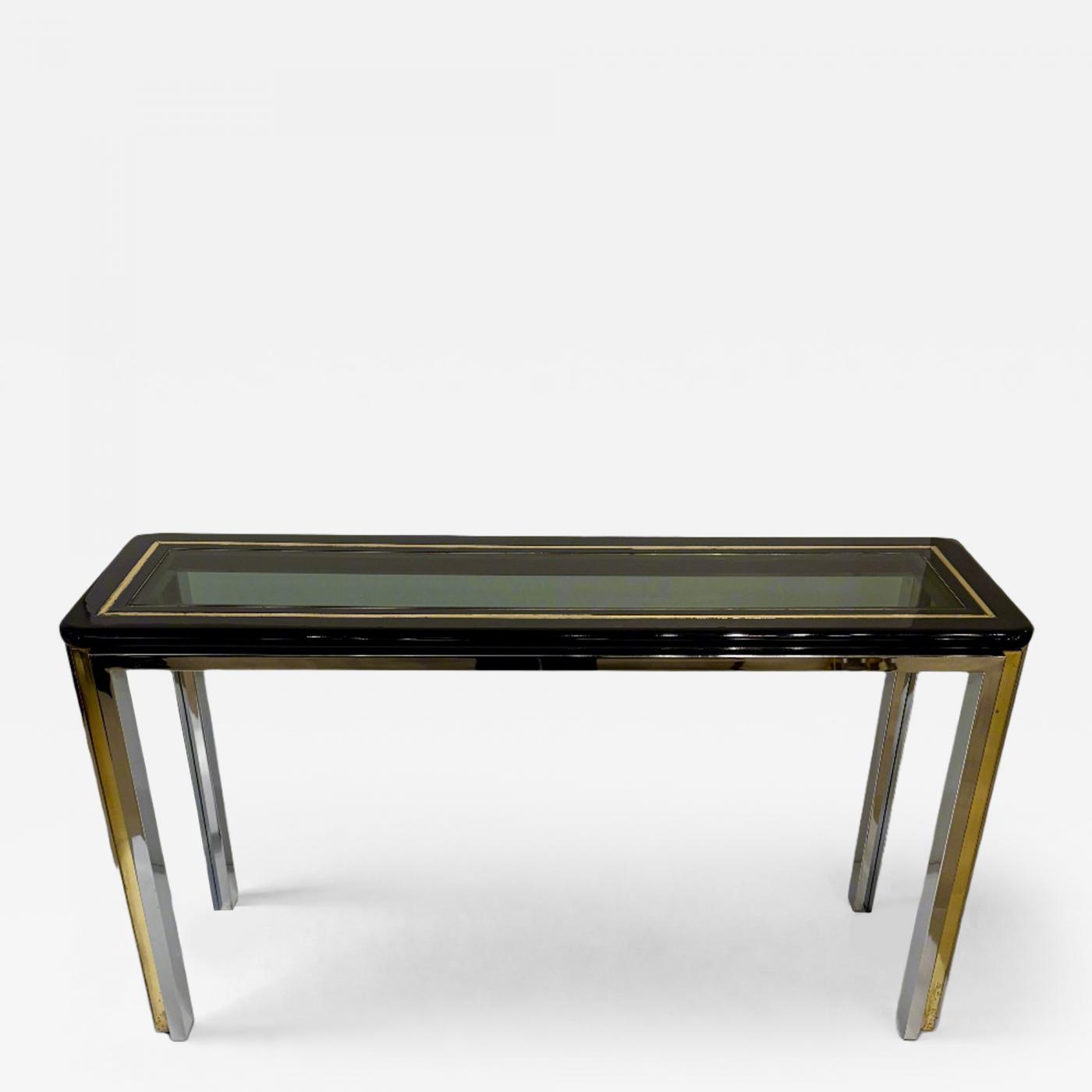 Architectural console table with faceted legs in chrome and brass, supporting a black lacquer framed top with glass inset and gold edge detail. Italy, 1960's
