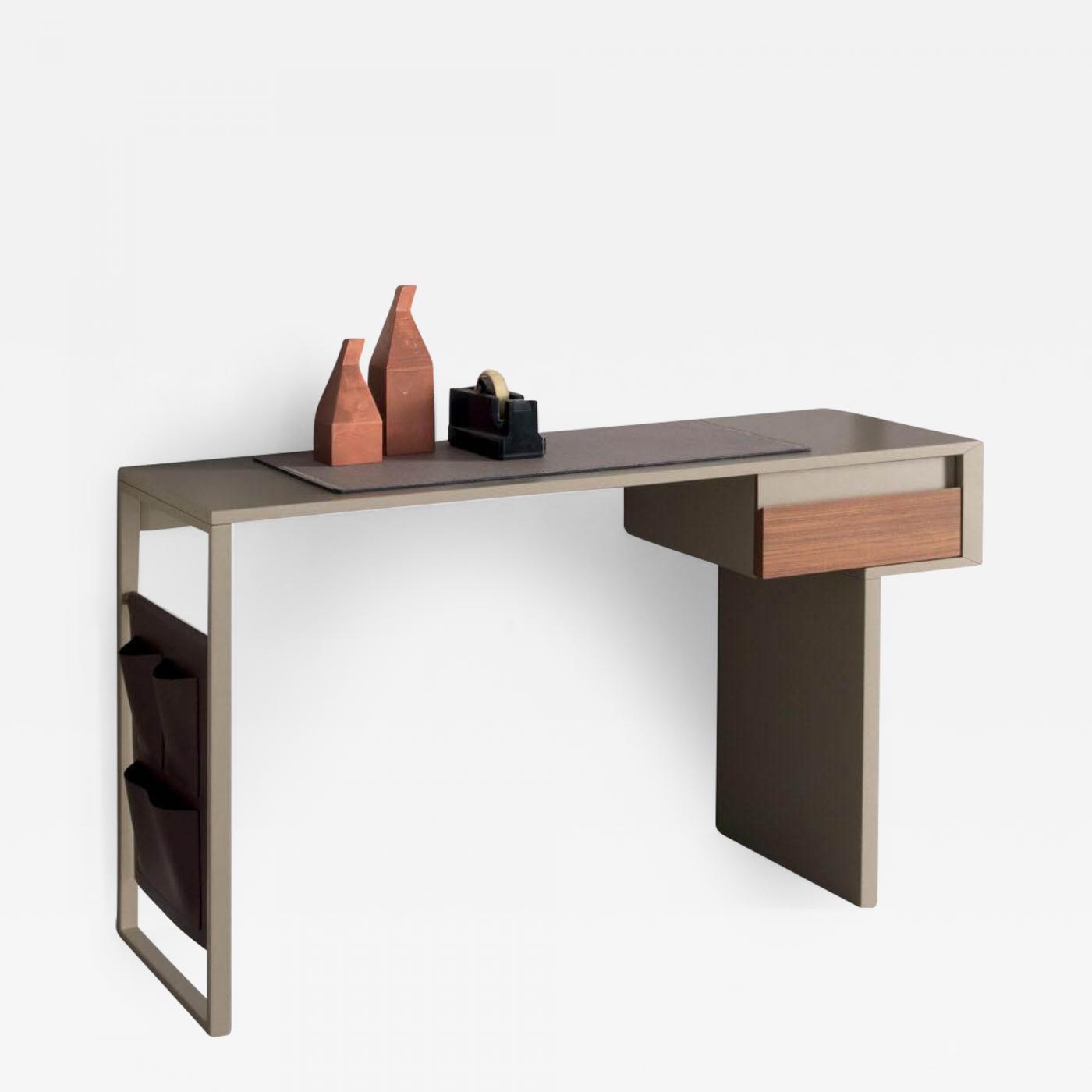 Desk in mat sand lacquered mdf with walnut wood veneered drawer. Pad and side pocket storage in moka regenerated leather, matched stitching.