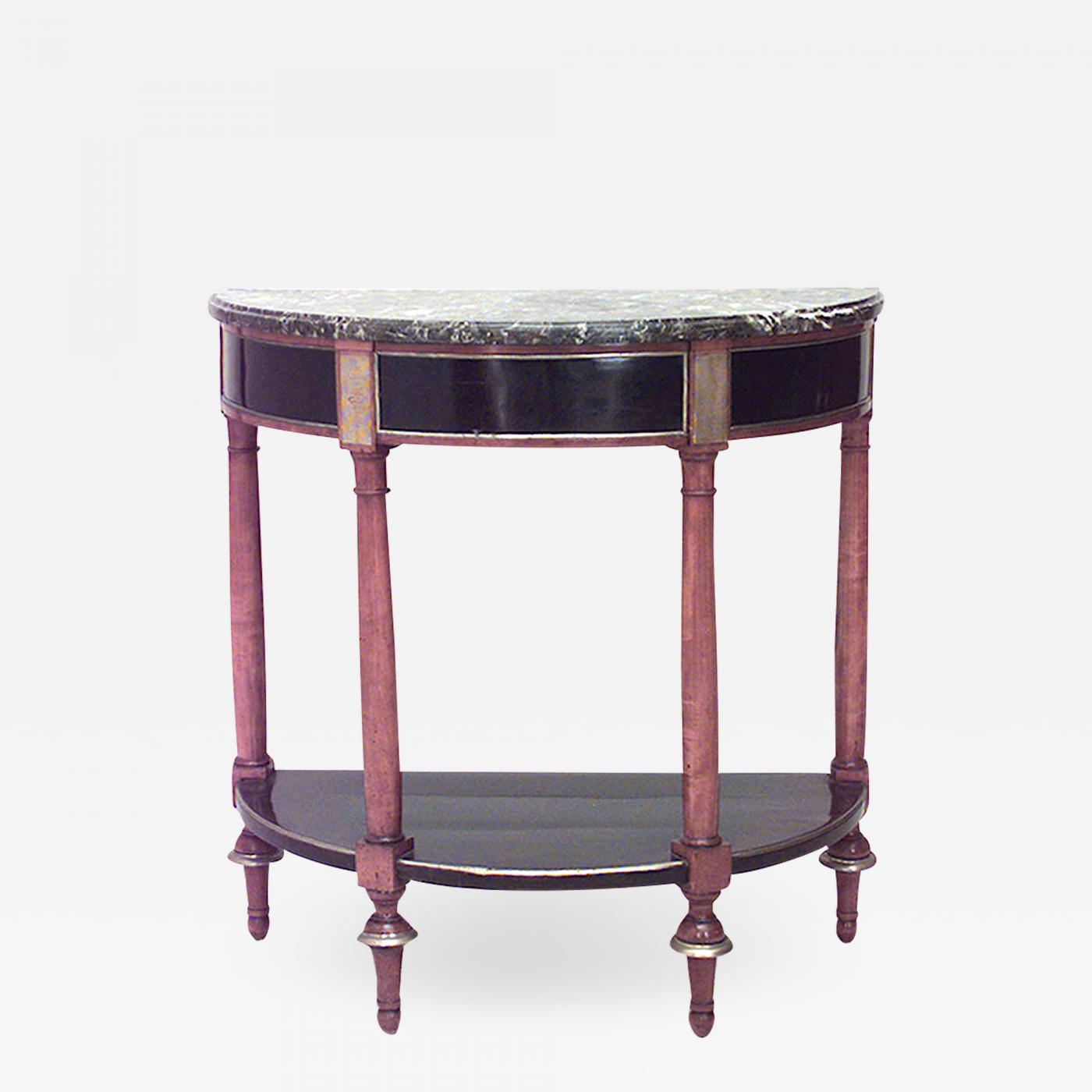 Continental Neoclassic (Likely Russian, 18/19th Century) brass mounted ebonized & fruitwood demilune console table with grey marble top above an undertier