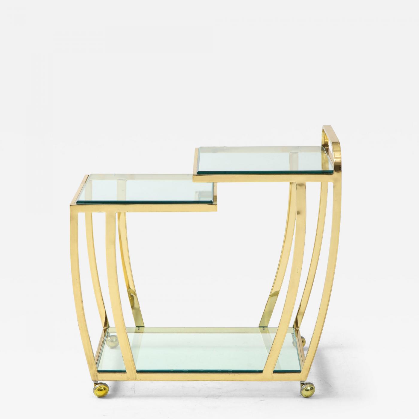 A great two level bar cart in brass and glass in the style of the Design Institute of America. Easy rolling on sealed ball bearing wheels.