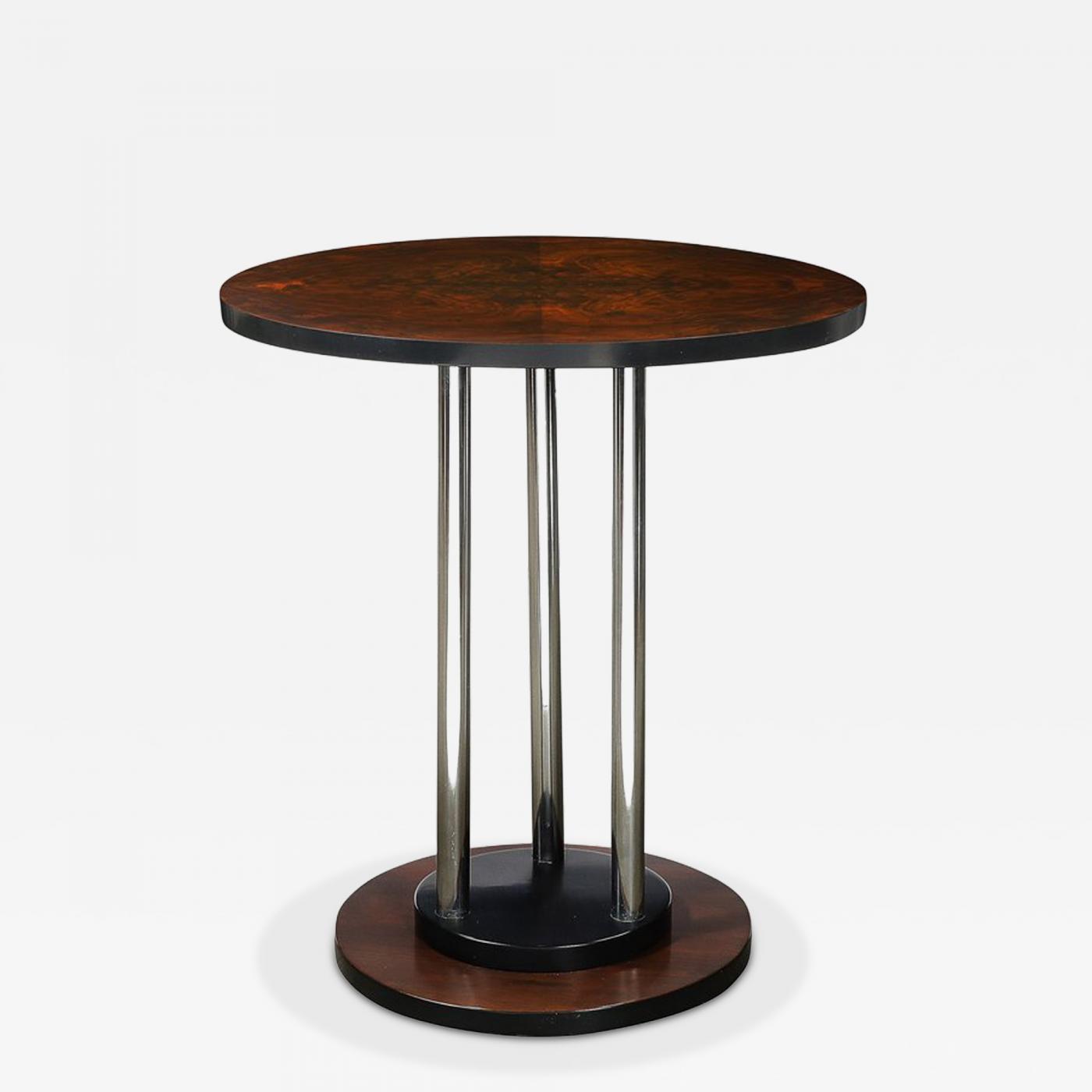 The table features stunning bookmatched walnut, creating a symmetrical, visually intriguing grain pattern that emphasizes the quality and elegance of the wood. The rich tones of the walnut are highlighted by black lacquer detailing, providing a striking contrast and further underlining the bold design aesthetic of the era. The inclusion of cylindrical chrome supports adds a modern, industrial edge, embodying the Machine Age's fascination with metal and clean lines.