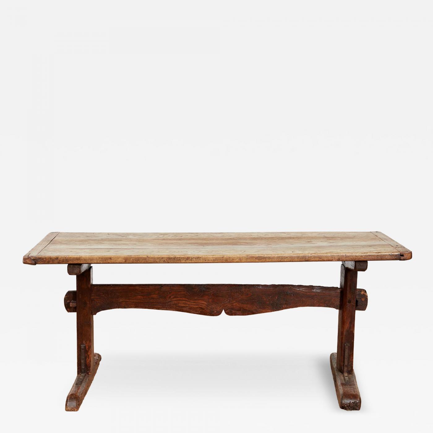 An early 18th century oak tavern table in elm and oak having three plank top with breadboard ends with a scrubbed patina over trestle ends joined by a wide upright stretcher with a shaped underside. One trestle significantly thicker than the other, implying that this table was probably made by an estate joiner rather than a cabinet maker, using available timbers. Iron reinforcement to trestles. One locking wedge replaced. A usefully sized table with lots of character.