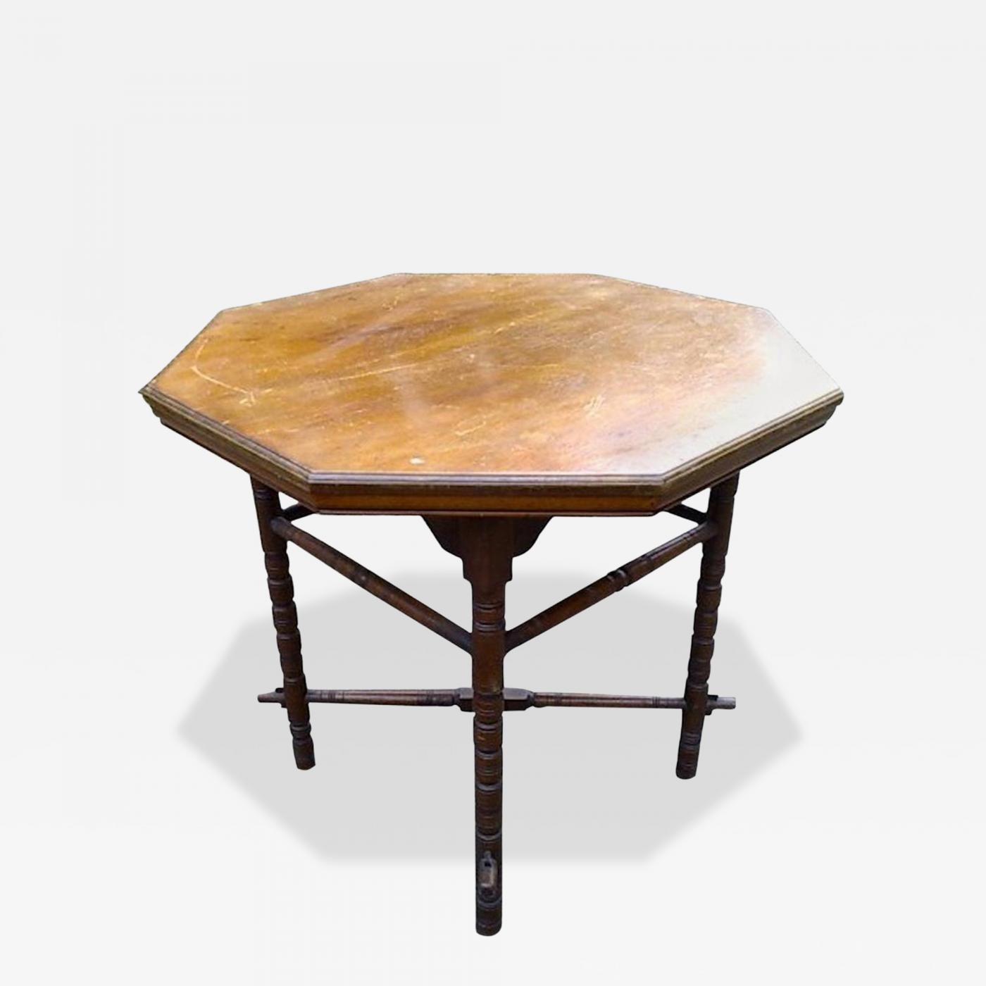 Depth: 29.13" || E. W. Godwin in the style of. An Aesthetic Movement Walnut octagonal centre or side table with arched apron below the top, he legs united by upper stretchers and also united by a lower a cross stretcher which follows through the lower legs with pegged joints. Original brass label : - S E and R. Johnson. Warrington. Cabinet Makers. Established 1837.