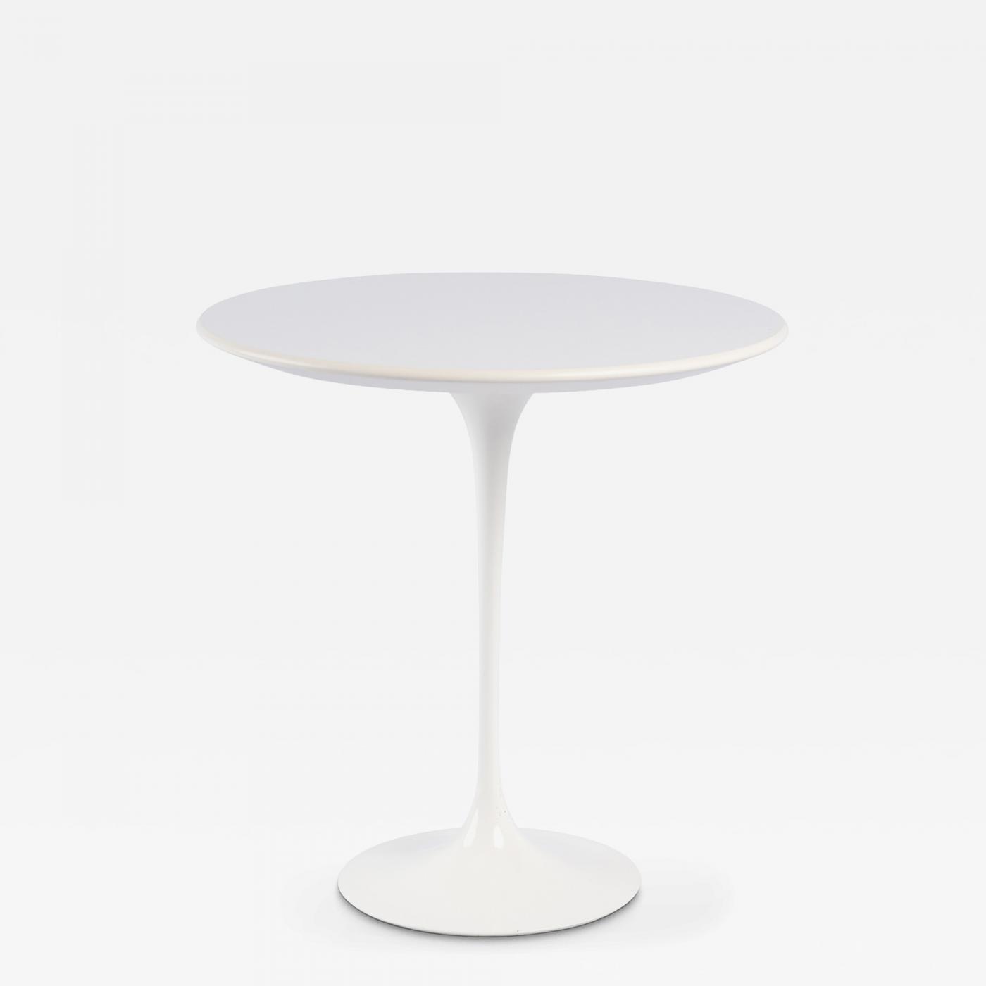 This particular piece is the 20” variation of the Pedestal Side Tables. Saarinen excelled in his sense of proportion, a quality very much true in this design. The surface space of the 20” diameter top is the largest of the Tulip side table suite. Whether the table is paired with an accent or lounge chair, pulled up in front of a sofa, or simply a pedestal to display an artifact; it is a design essential which every home needs. The piece is designed with satin White Laminate and finished with a white painted cast Aluminum base. -