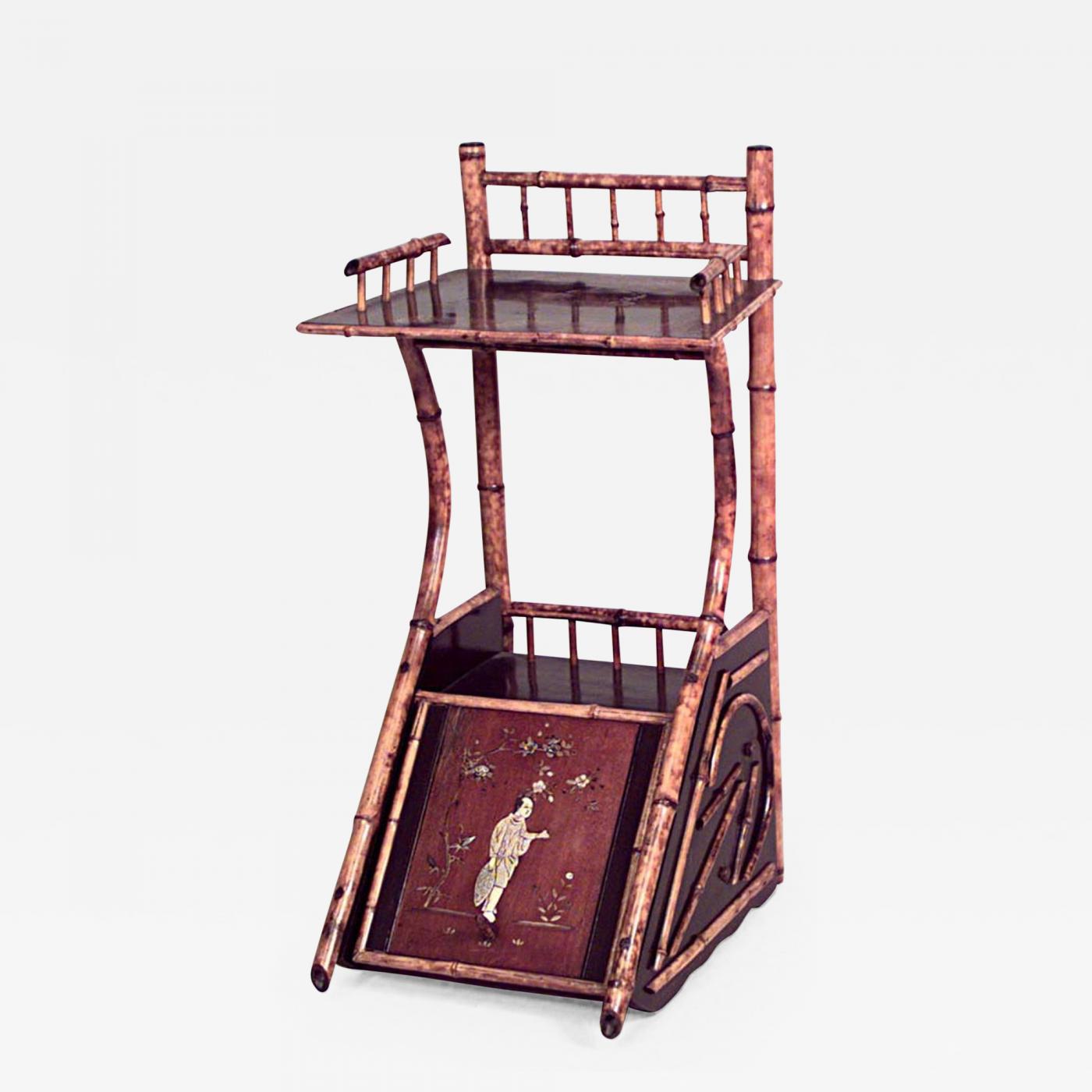English Victorian bamboo and black lacquer shaped side end table with gallery and lift front door at base