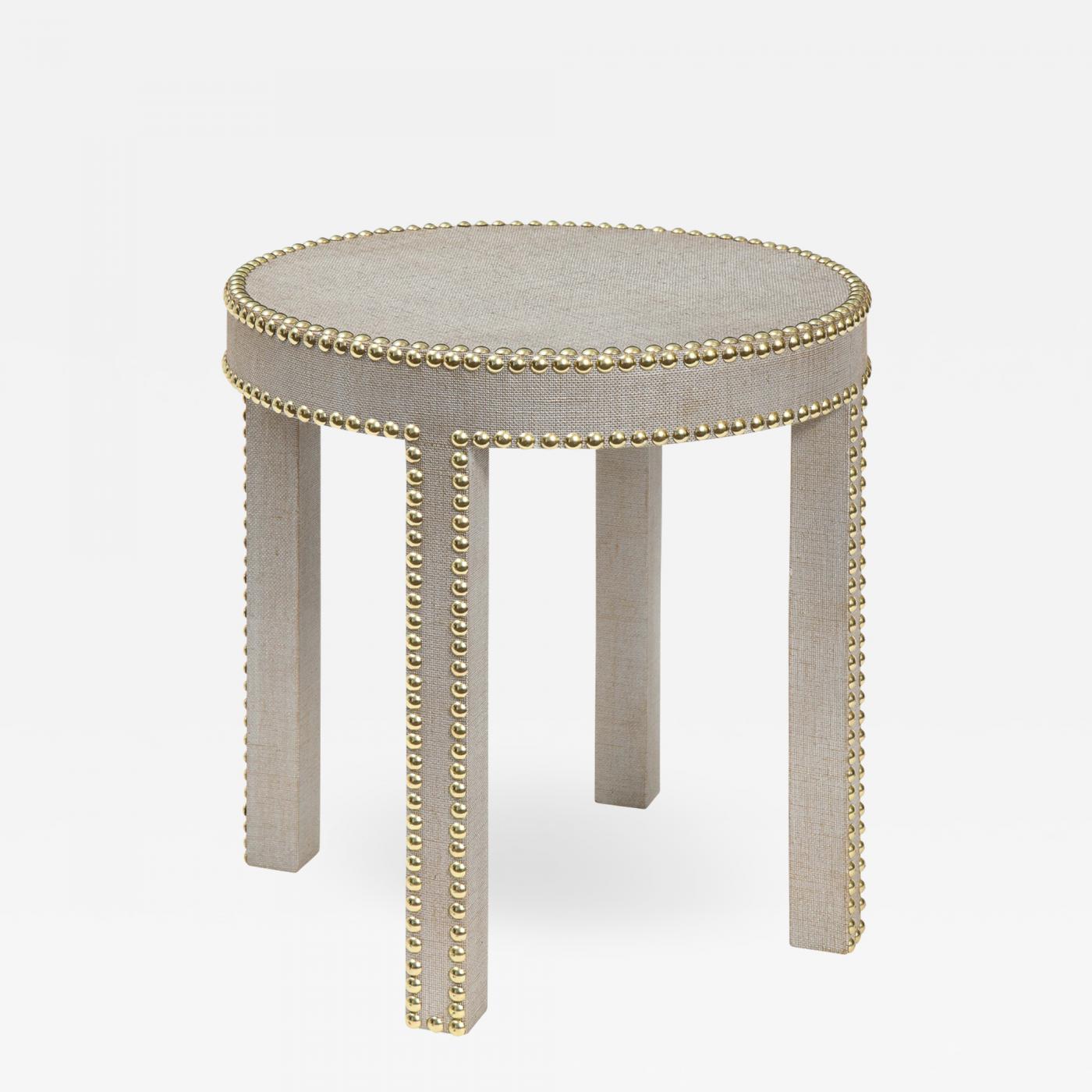 Round side table covered in platinum lacquered linen with brass studs around top and legs by Evan Lobel for Lobel Originals, American 2021.