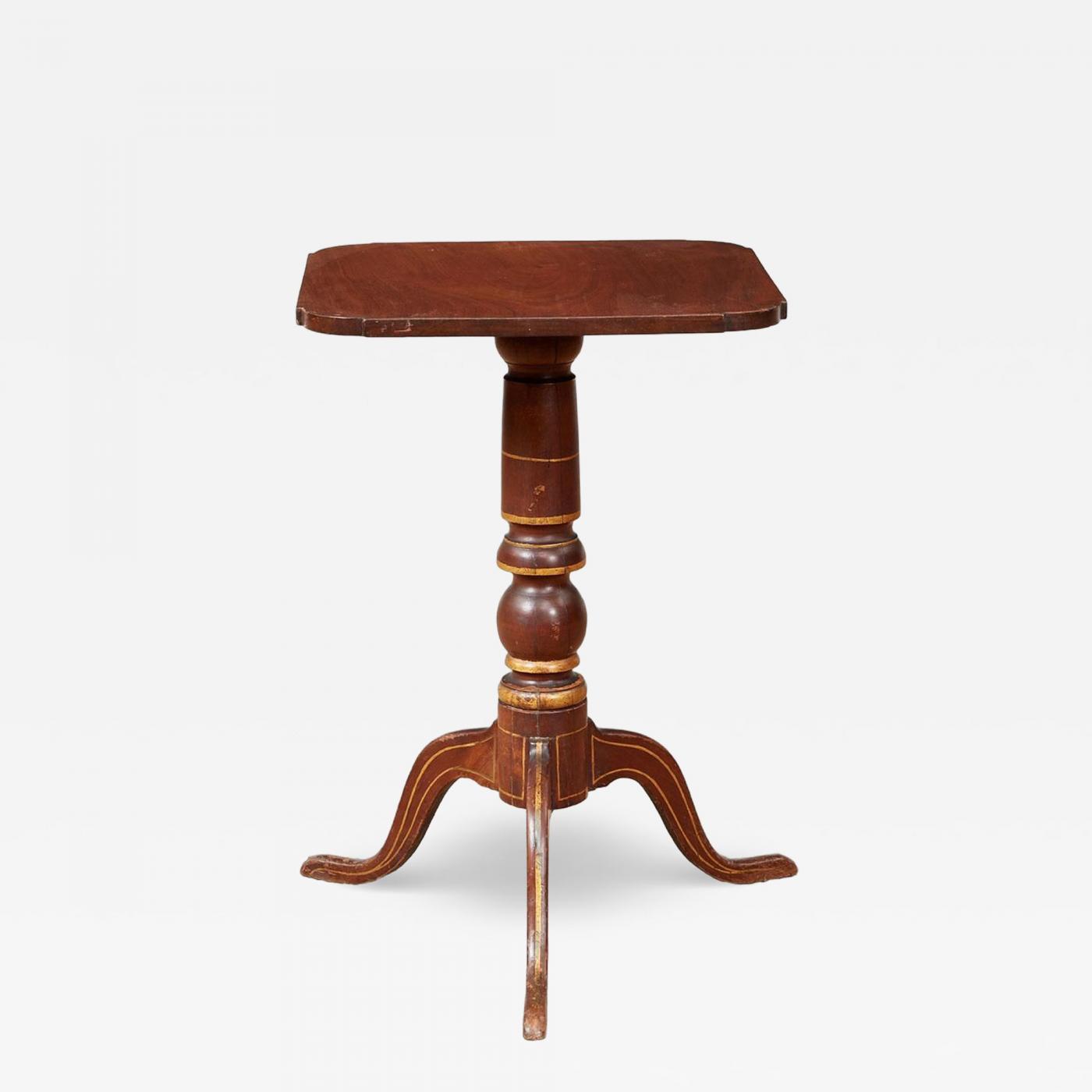 A rare early 19th century American mahogany tripod pedestal table retaining original folk line painting to turned shaft and shaped feet. Featuring a square single plank top with shaped corners in fine quality mahogany with swirl grain. Circa 1820