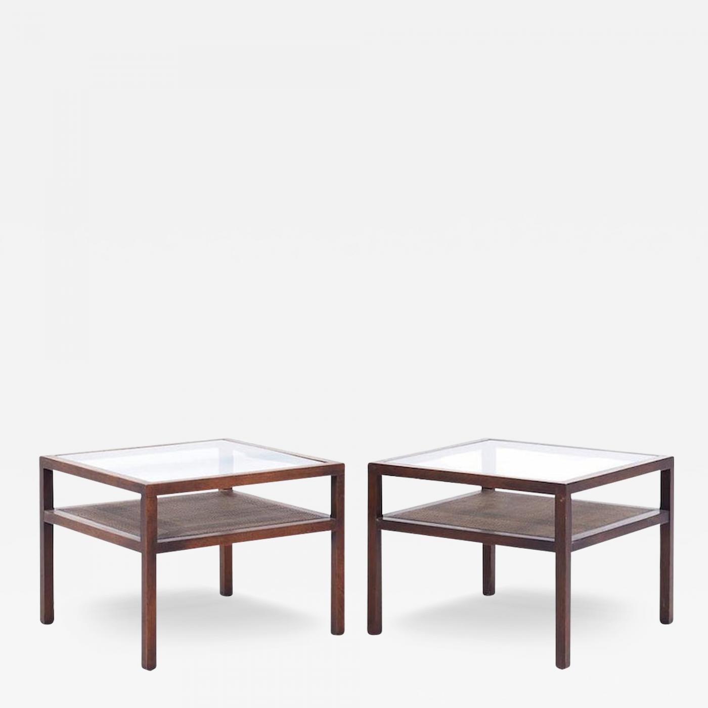 Founders Style Mid Century Oak Cane and Glass End Tables - Pair