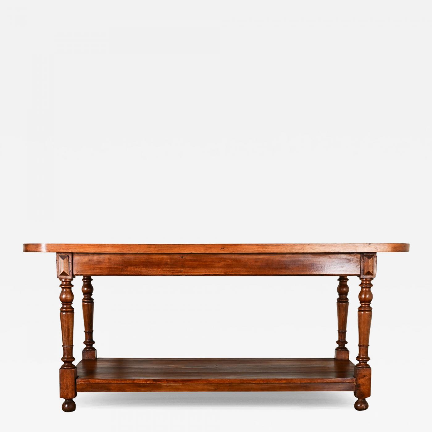 A unique drapery table from Burgundy, France, dating to the late 1800s. The tall and large surface area is ideal for any creative pursuit, artistic to culinary, which makes this example perfect as an unexpected kitchen island! The thick and forgiving top surface is made of two, solid oak planks (1 ¾” thick), rounded at the corners for your comfort. The baluster table legs are expertly turned in a gorgeous profile, leading down to the open storage or display shelf. Wear consistent with age and use, please be sure to view the detailed images.