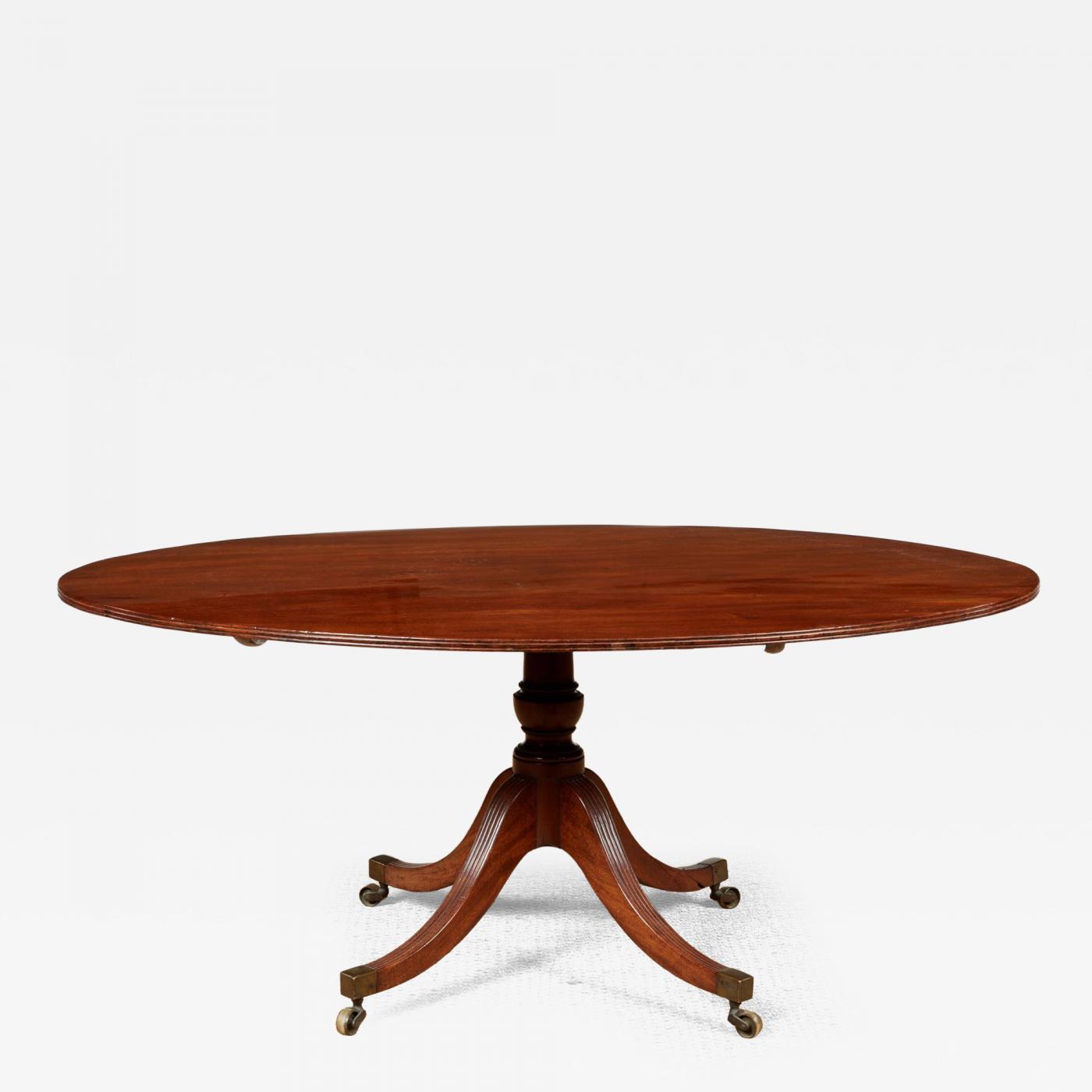 Fine George III mahogany oval breakfast table, the remarkable single plank top with vivid graining and lustrous finish, having reeded edge and original tilt top hardware, over vasiform turned shaft and standing on reeded saber legs ending in original brass casters.