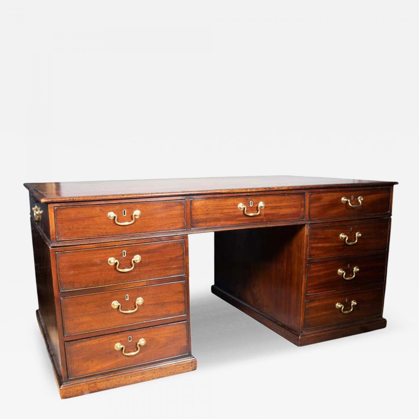 With a rectangular tooled brown leather top with cross-banded edge over a frieze containing three drawers with brass bail handles. The reverse with same working drawers. In three parts with a top and two pedestals. The pedestals with three drawers on the front and a pair of cabinet doors on the reverse. Brass bail handles on the sides. Plinth base.