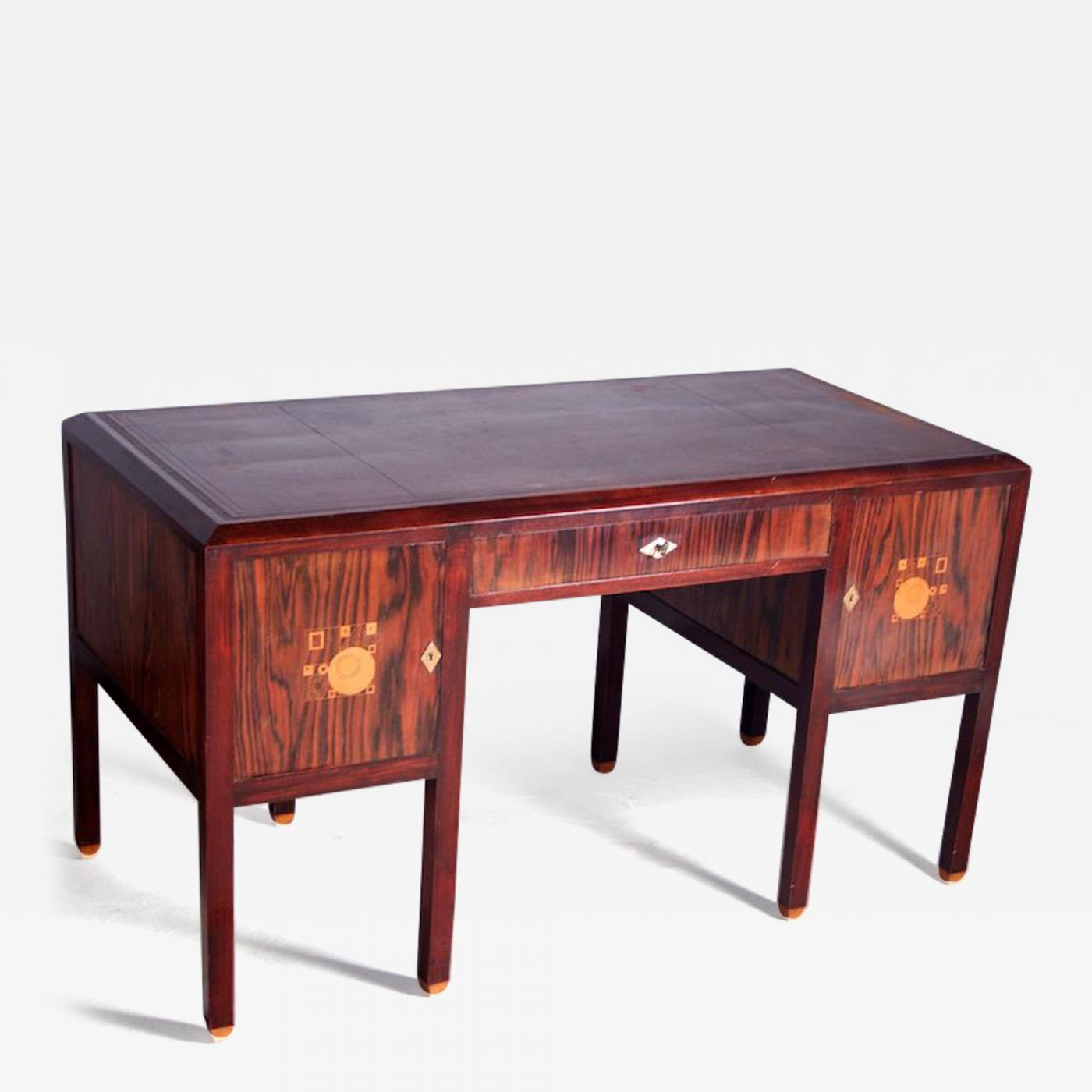 French Modernist Art Deco desk and armchair designed by George Champion for Guerin (signed with tag), circa 1930-35. Macassar ebony, ebony, and sycamore woods, with original leather top. 52” wide x 26” deep x 29” high.