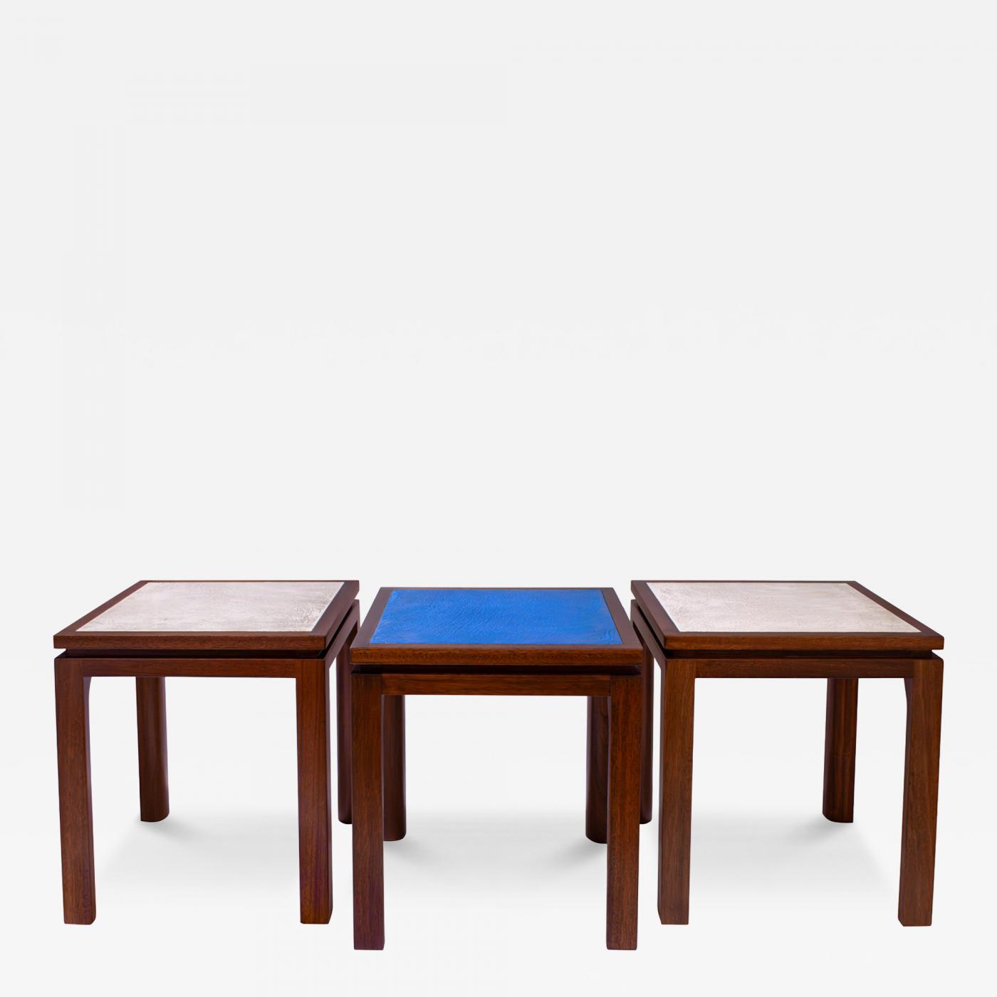 Set of 3 coffee tables model No 1145 in mahogany with hand fired white and blue "enamel on copper" tops by Harvey Probber, American 1950's. These studio made enamel tops were created by the noted artist Arpad Rosti. Probber often collaborated with artists to incorporate their works into his pieces.
