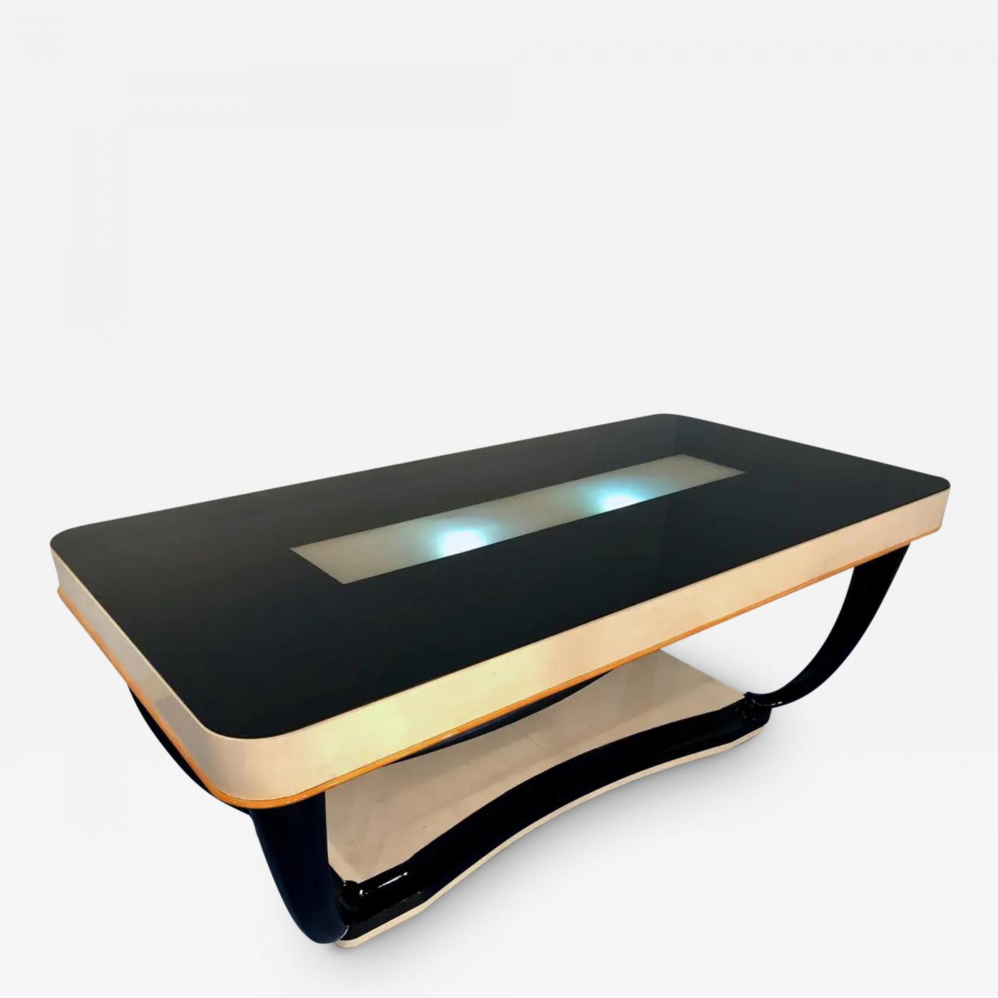 Luxurious and stylish Italian midcentury parchment dining table with an illuminated black glass top. The table legs are really elegant in black lacquered mahogany wood. The tableside is in parchment, you can notice a maple line on the final part. The base has a refined design also in parchment.