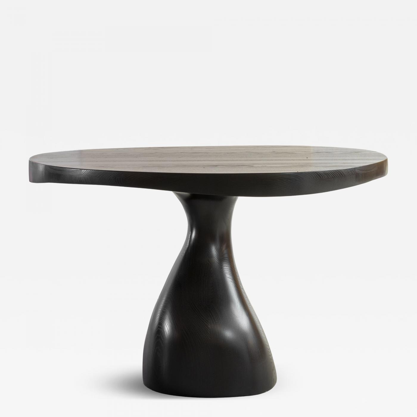 Inspired by the sinuous lines of his iconic Leda floor lamp, Jacques Jarrige created this larger center table as a continuation of his exploration of movement and space. Hand-carved in stained oak, the piece embodies Jarrige’s signature approach to sculpture—where form emerges through subtraction, and negative space becomes as vital as the material itself.