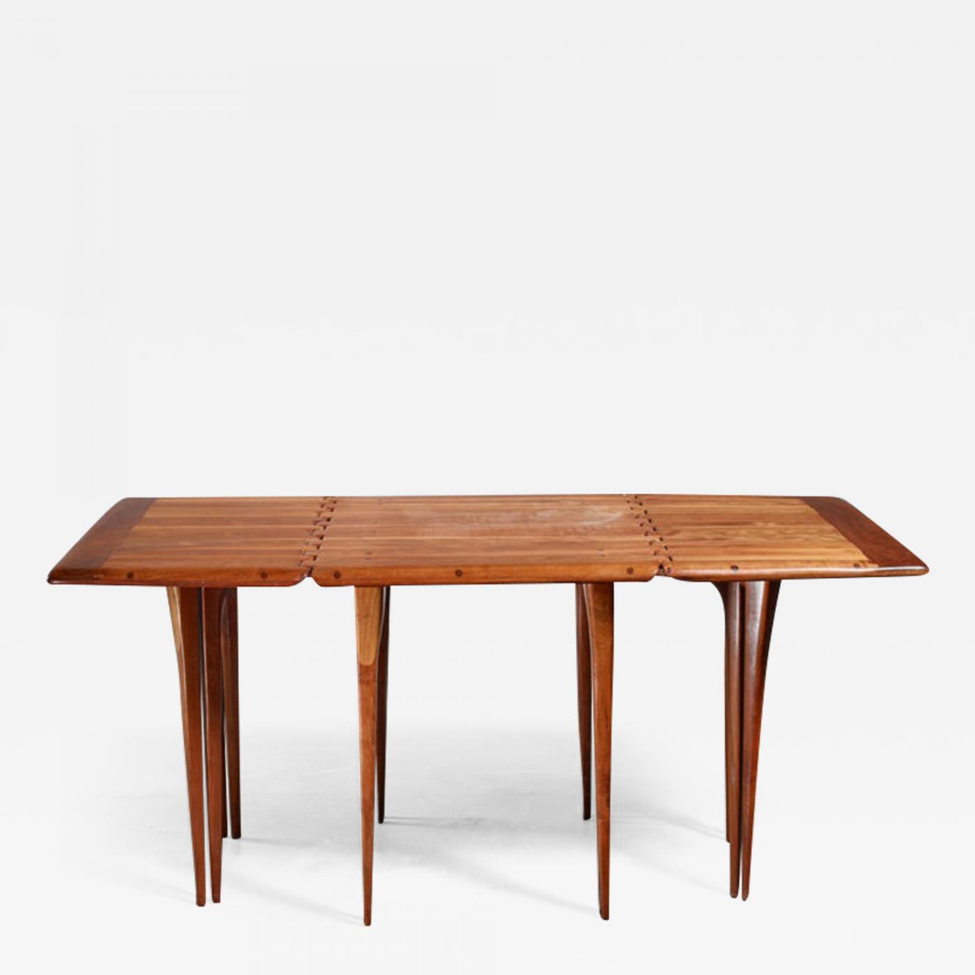 A unique studio craft drop leaf table by American woodworker Lee Swennes (1936 - 2016), made of walnut and koa wood. The table has two leaves and sixteen legs.