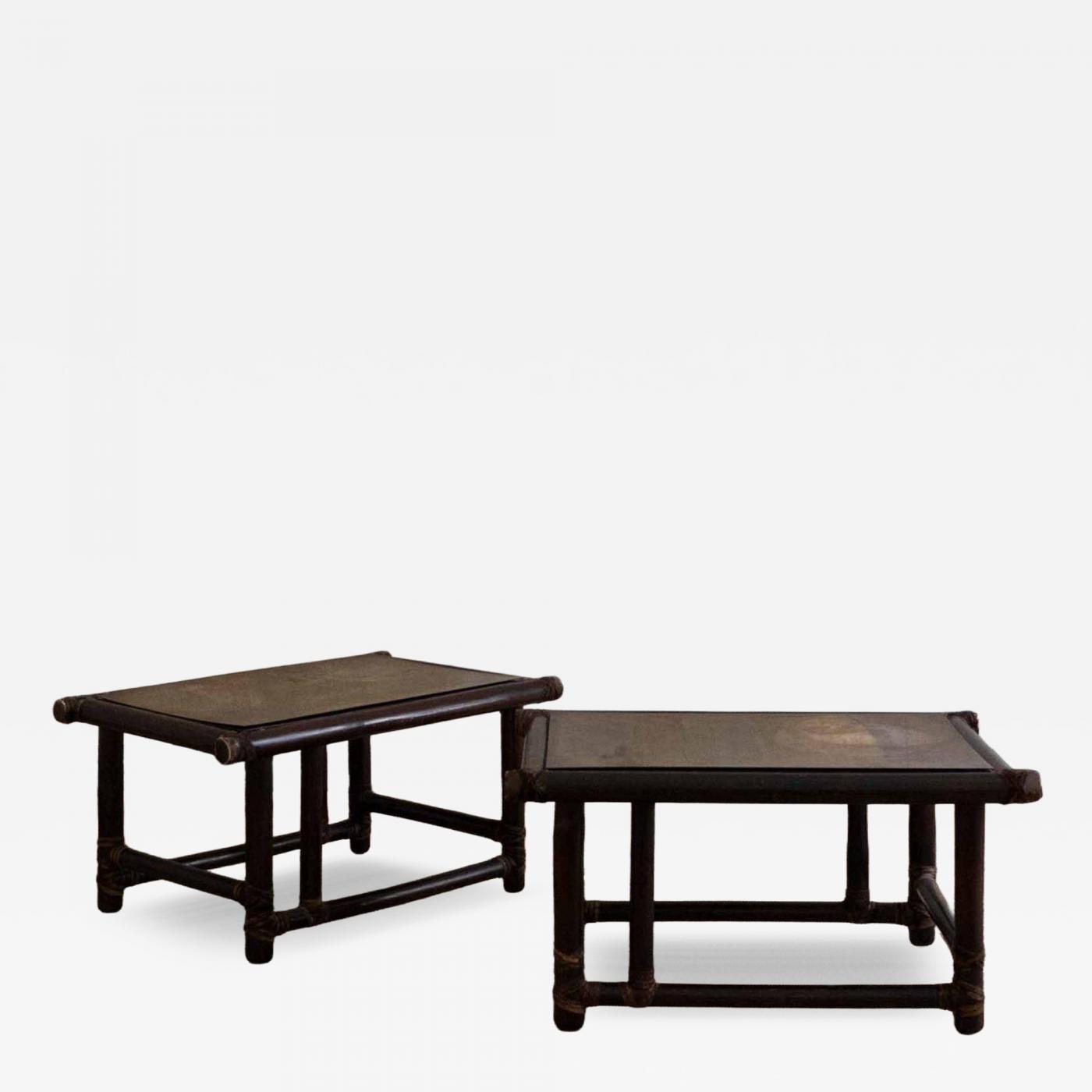 Pair of Wooden Tables (Dark Finish) with Leather Bindings by Lyda Levi for Mcguire San Francisco 1970
