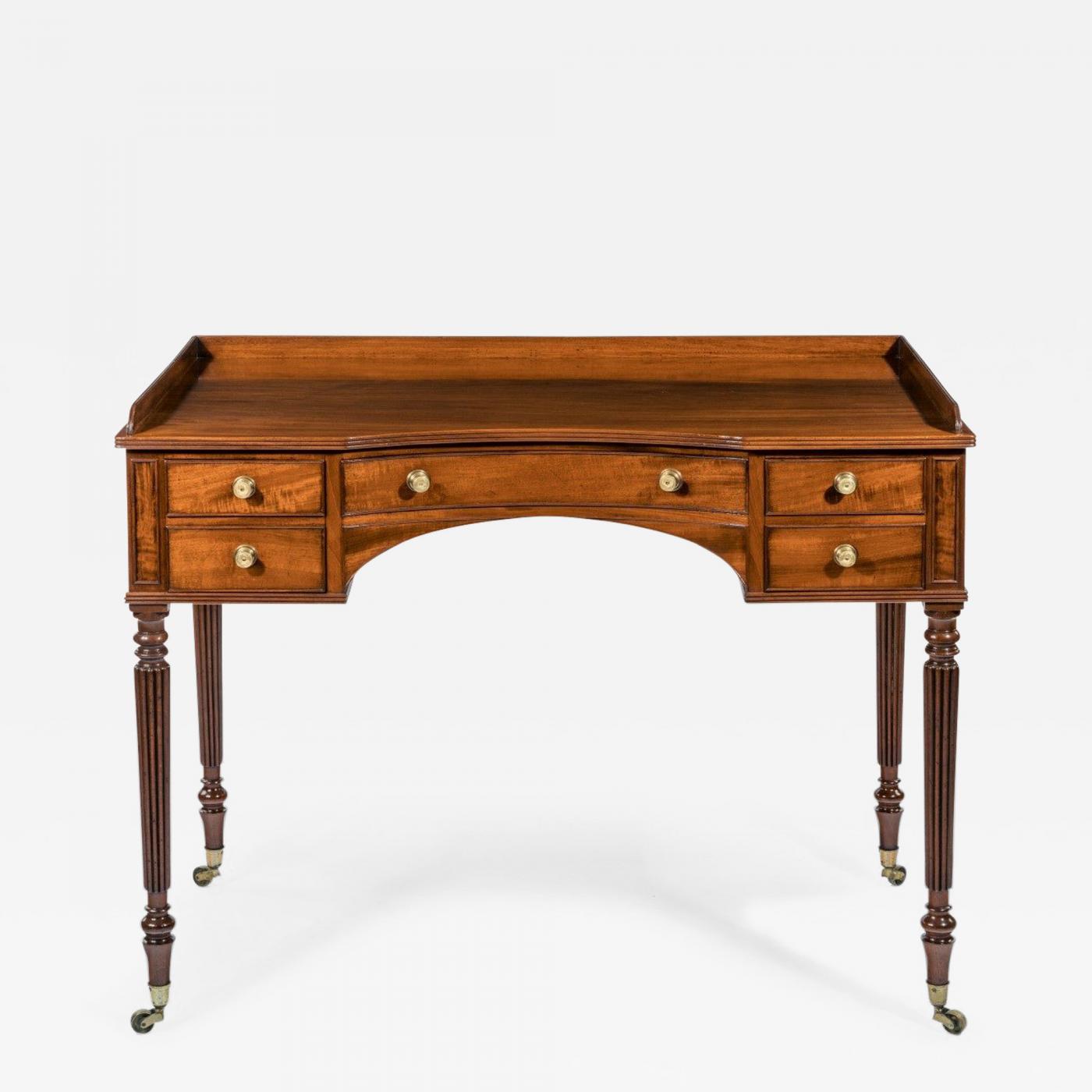 A fine mahogany dressing table attributed to Gillows of Lancaster, the shaped rectangular top with a central recess above the long concave drawer, flanked four small drawers, on reeded tapering legs and brass caps and casters, English c1810.
