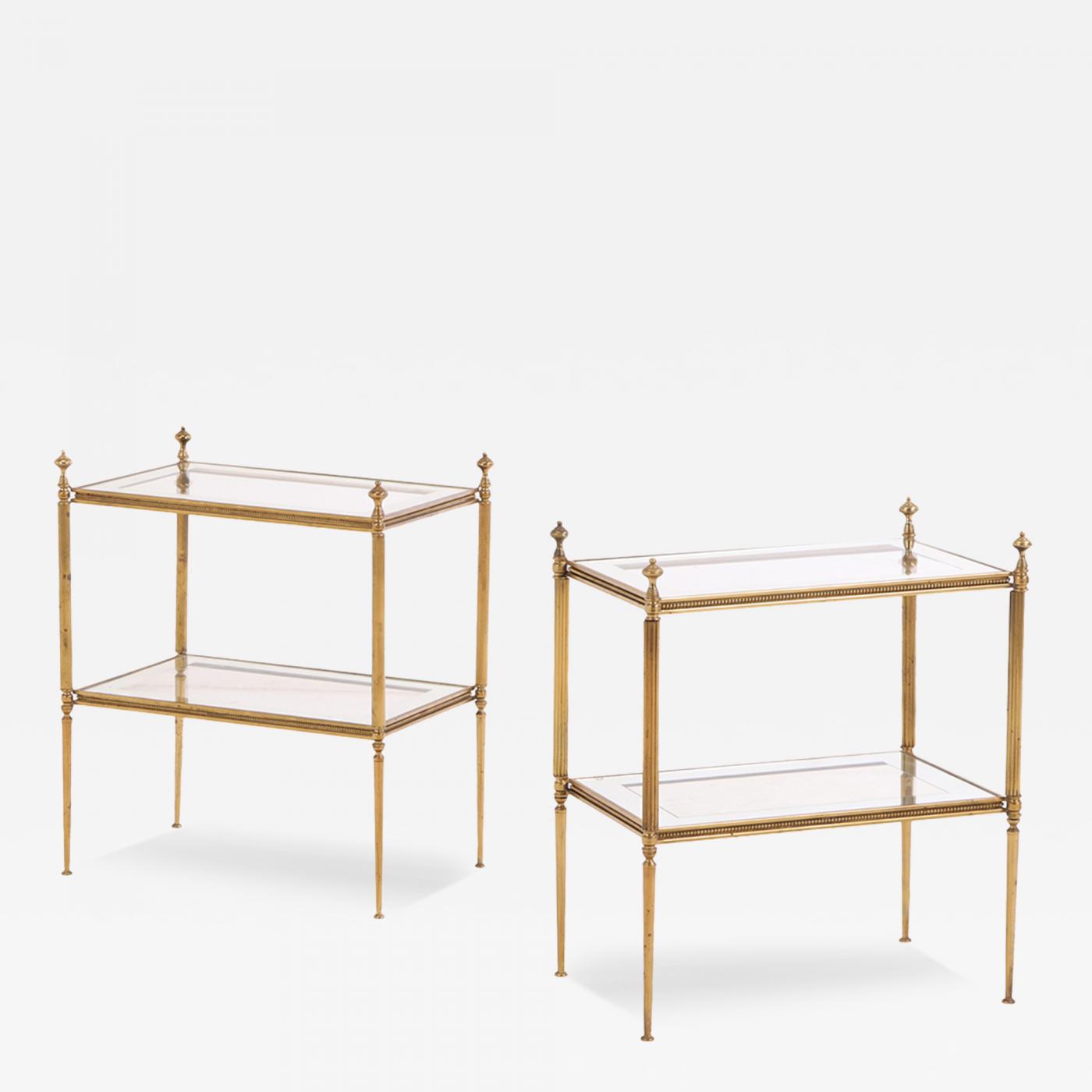 Each table features a brass frame with two glass shelves edged in a silvered border. Elegant storage and versatile, they offer mid-century sophistication and are ideal as side or cocktail tables.