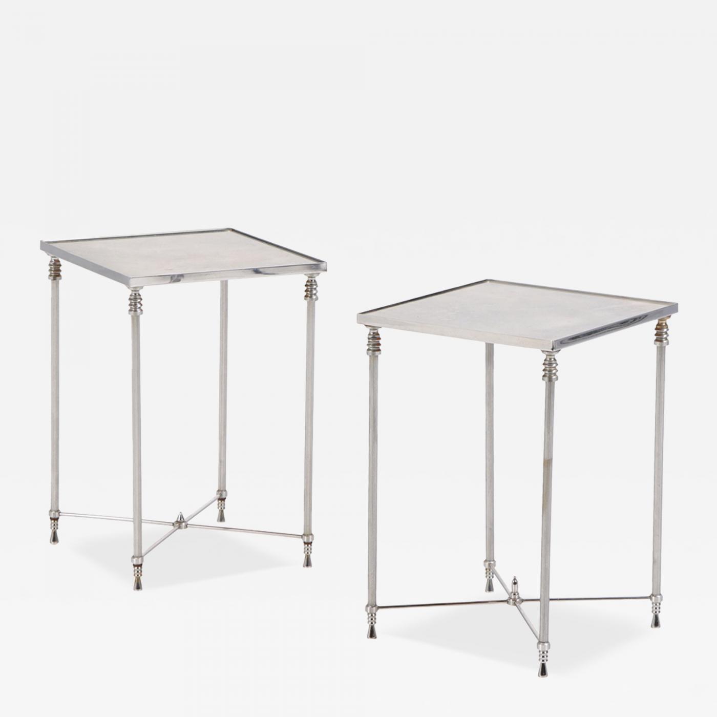 Each table features a square mottled mirrored top set within a silver-plated frame, supported by slender tapering legs united by a cross stretcher centered with a small finial.
