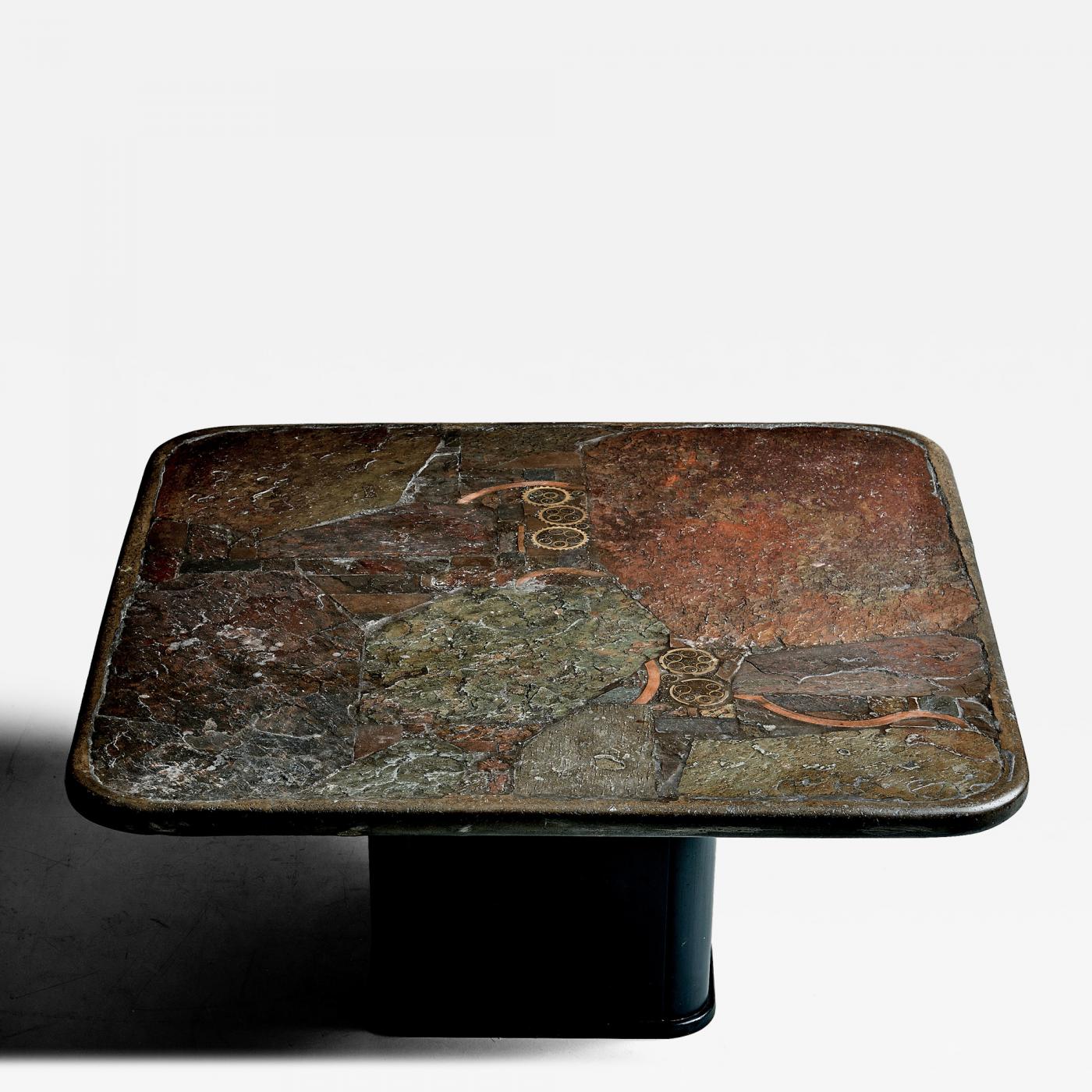 This sculptural coffee table by Marcus Kingma treats furniture as a composed surface rather than a neutral object. The square top is built from irregular fragments of natural stone set in resin, creating a richly textured “terrain” of rust, slate, and mineral greens. Precise brass and copper inlays—arcs and clustered ring motifs—cut through the geology like quiet diagrammatic marks, balancing raw materiality with measured geometry. The top rests on a dark pedestal base, giving the heavy slab a poised, architectural presence. Signed “M. Kingma 1986 " within the composition. Vintage condition with minor wear and a natural patina consistent with age.