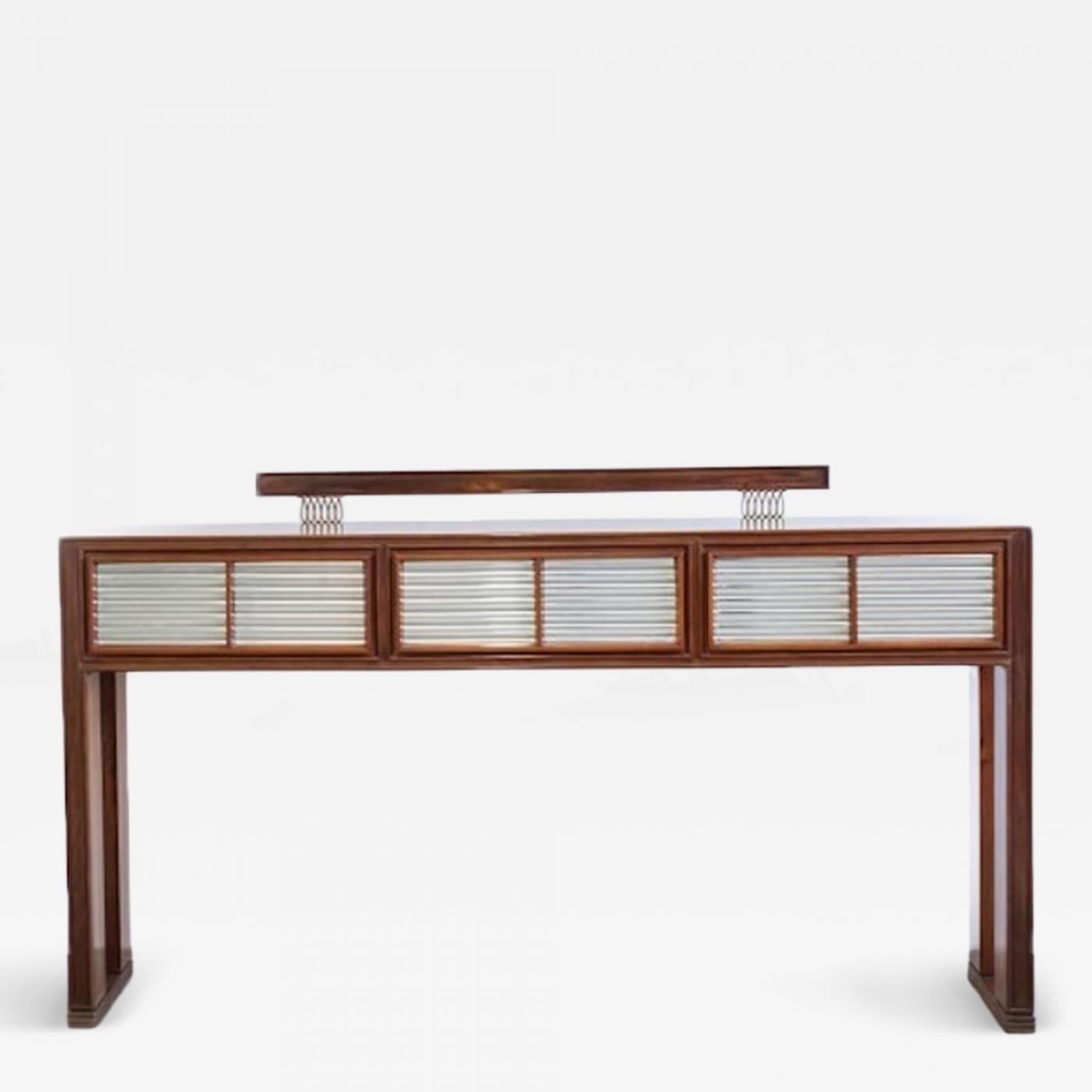 Rare and exceptional three-drawer console by Mario Quarti, Italy, circa 1930, in mahogany with brass detail, frosted and mirrored glass drawer fronts, with maker's label to drawer interior [E. Quarti S.A. Milano]. Provenance available. - More Information
