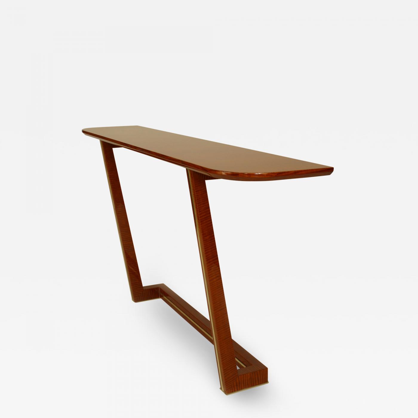 2 French 1940s style (modern) mahogany veneered console tables with a rounded rectangular top on a pair of "L" form legs and stretcher with bronze trim (style of MAXIME OLD) (PRICED EACH)(CAN BE CUSTOMIZED SIZE)