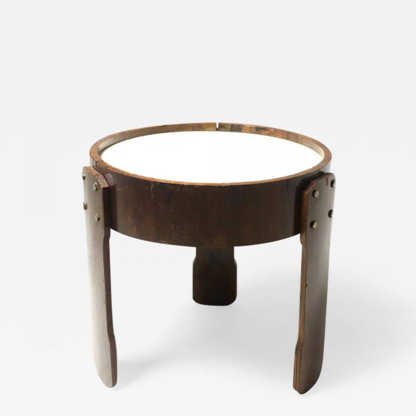 Structured in molded plywood, this 1960s round side table stands over three legs and features a white Formica top.