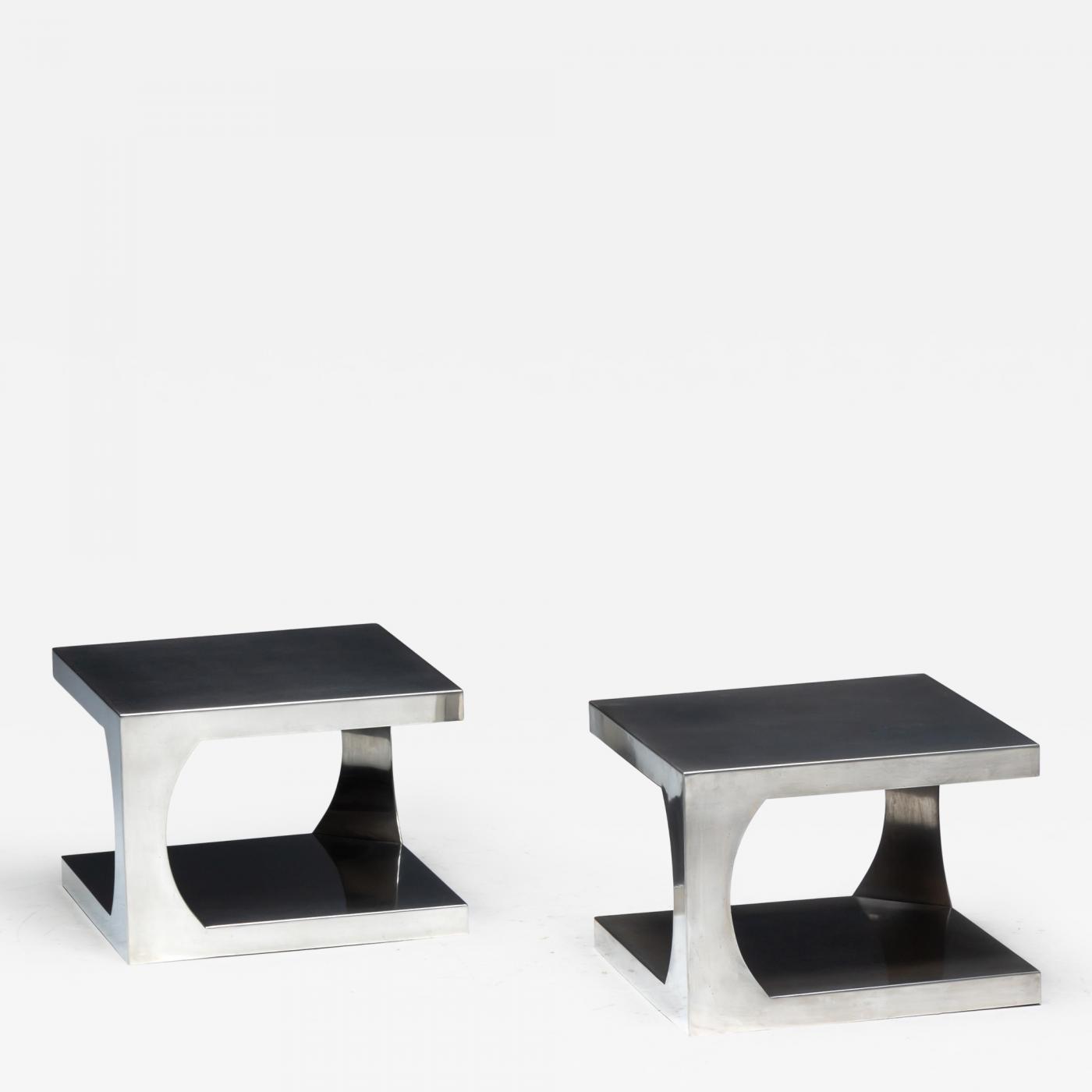 1970s sculptural modernist aluminum side tables featuring a bold open-frame design and softly curved interior cutouts. Crafted from solid aluminum, they offer a refined brushed finish with a warm, architectural presence. Their minimalist geometry and reflective planes make them striking both alone and paired as a modular coffee table. Lightweight yet substantial in appearance, they embody the clean industrial elegance of the era. Priced individually.