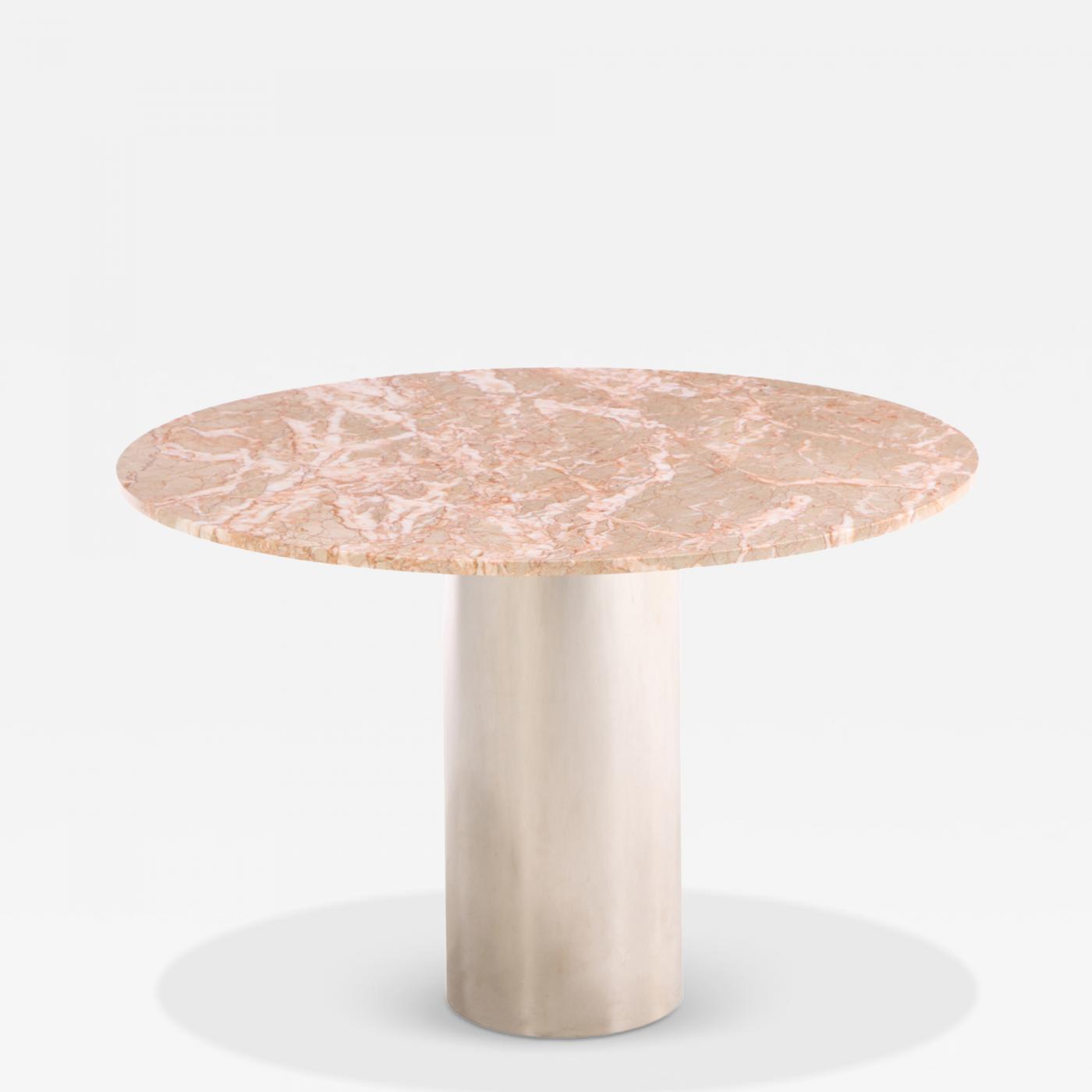 Round dining table attributed to Breuton, crafted in the 2010s. The top is Breccia Oniciata marble with distinctive orange, rose, and cream veining over a beige field, paired with a polished chrome cylindrical pedestal base. A striking combination of natural stone and modernist clarity.