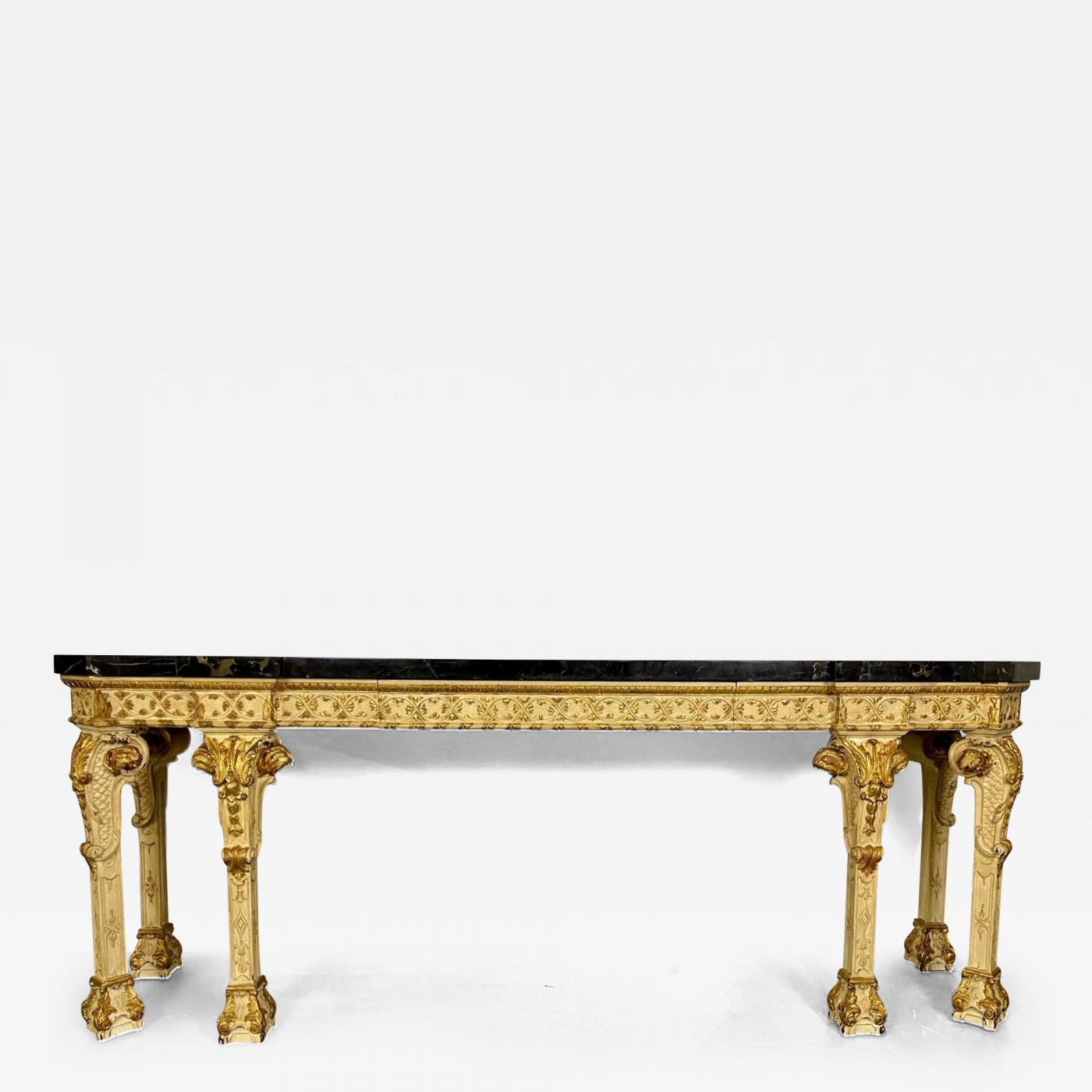 A stunning console table or sideboard featuring a parcel gilt and paint decorated base with a single drawer supporting a massively thick and impressive black, white and gray veined marble top. Six intricately carved, cabriole style legs in a cream paint with gilt gold carved cabriole legs decorated with floral and shell design.