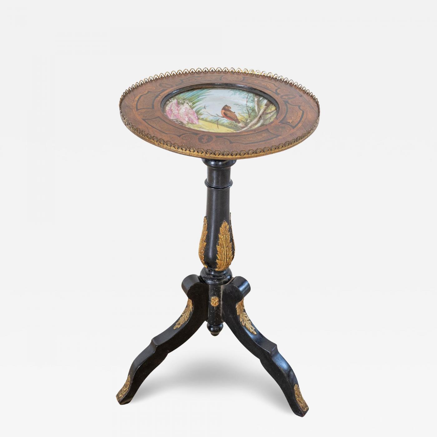 A captivating Napoleon III period pedestal table from 19th-century France, showcasing the elegance and artistry characteristic of the Second Empire. The table features a richly black lacquered finish complemented by finely cast gilt bronze mounts in the form of acanthus leaves, reflecting exquisite neoclassical influence. Its round top is bordered by a pierced brass gallery and a refined marquetry inlay that frames a hand-painted earthenware basin at the center. The basin depicts a delicate pastoral scene — a small bird poised on a flowering branch — rendered with exceptional detail and soft coloration. The turned central pedestal terminates in a sculpted tripod base, each foot gracefully ornamented, balancing decorative grandeur with structural poise. This table embodies the refined craftsmanship and romantic sensibility of the Napoleon III era, making it both a functional accent and a collector’s statement piece suited for elegant interiors or curated decorative settings.