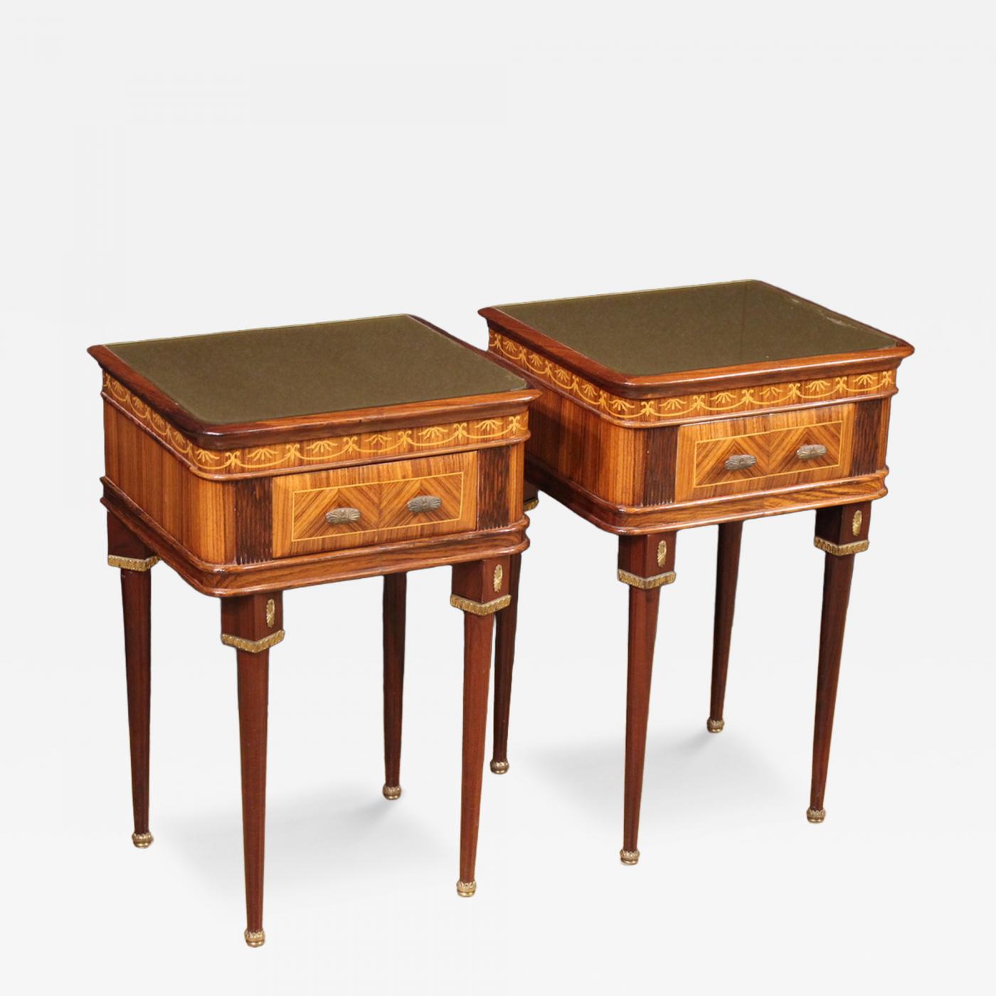 The bedside tables stand on sturdy tapered legs with gilded and chiseled brass feet and decorations. Ideal for a bedroom or living room, for antique dealers, and interior decorators. Structurally sound, overall in good condition. -