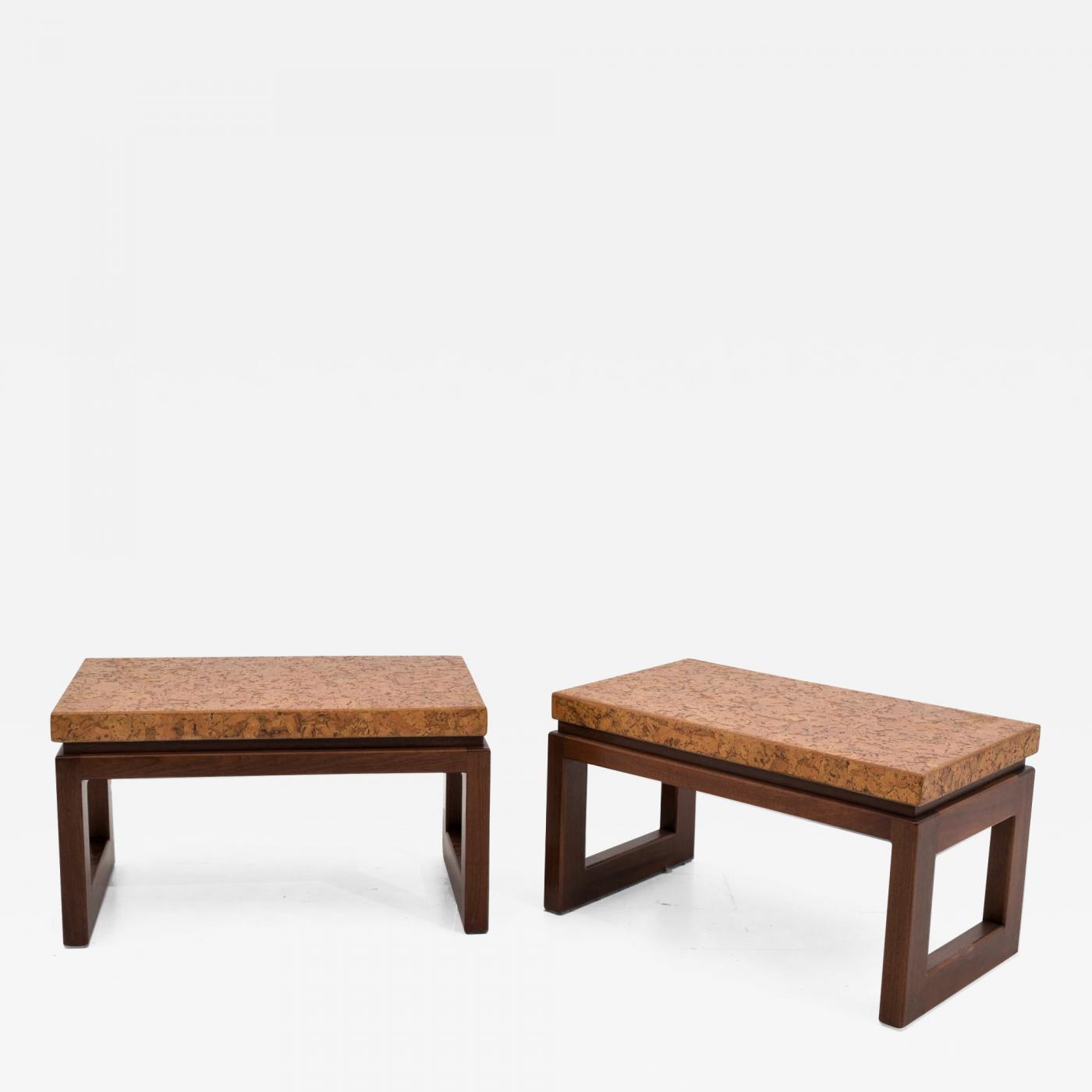 Pair of rectangular side tables with cork top by Paul Frankl for Johnson Furniture. They have four legs in the shape of a contrasting frame.