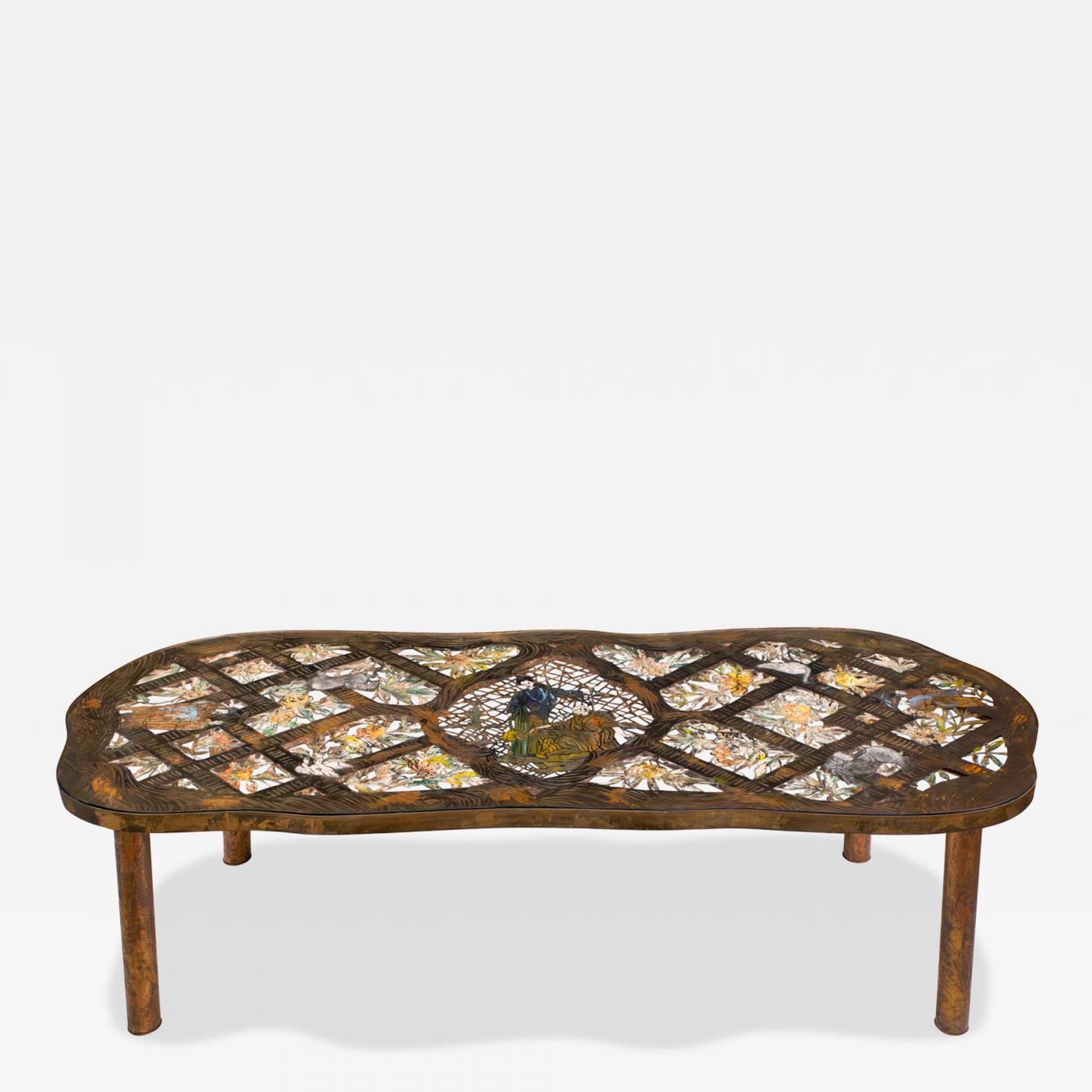 ALCHEMY: THE ART OF PHILIP AND KELVIN LAVERNE written by Evan Lobel with Kelvin LaVerne, published by Pointed Leaf Press in 2024, this coffee table is shown on pages 85 in the section Historical Civilization Series. The caption reads, “The 1960s FRAGONARD PIERCED coffee table is one of...Origin: United States Period: 1950-1979 Materials: Bronze, Pewter, Enamel Cloisonne, Gold Leaf, Copper Leaf, Glass - Handcrafted Condition: Good. Condition: Excellent Creation Date: 1960s Number of Pieces: 2-3 Styles / Movements: Studio Craft, Collectible Design, Mid Century Dealer Reference #: coffeetable549 Incollect Reference #: 829224 -
