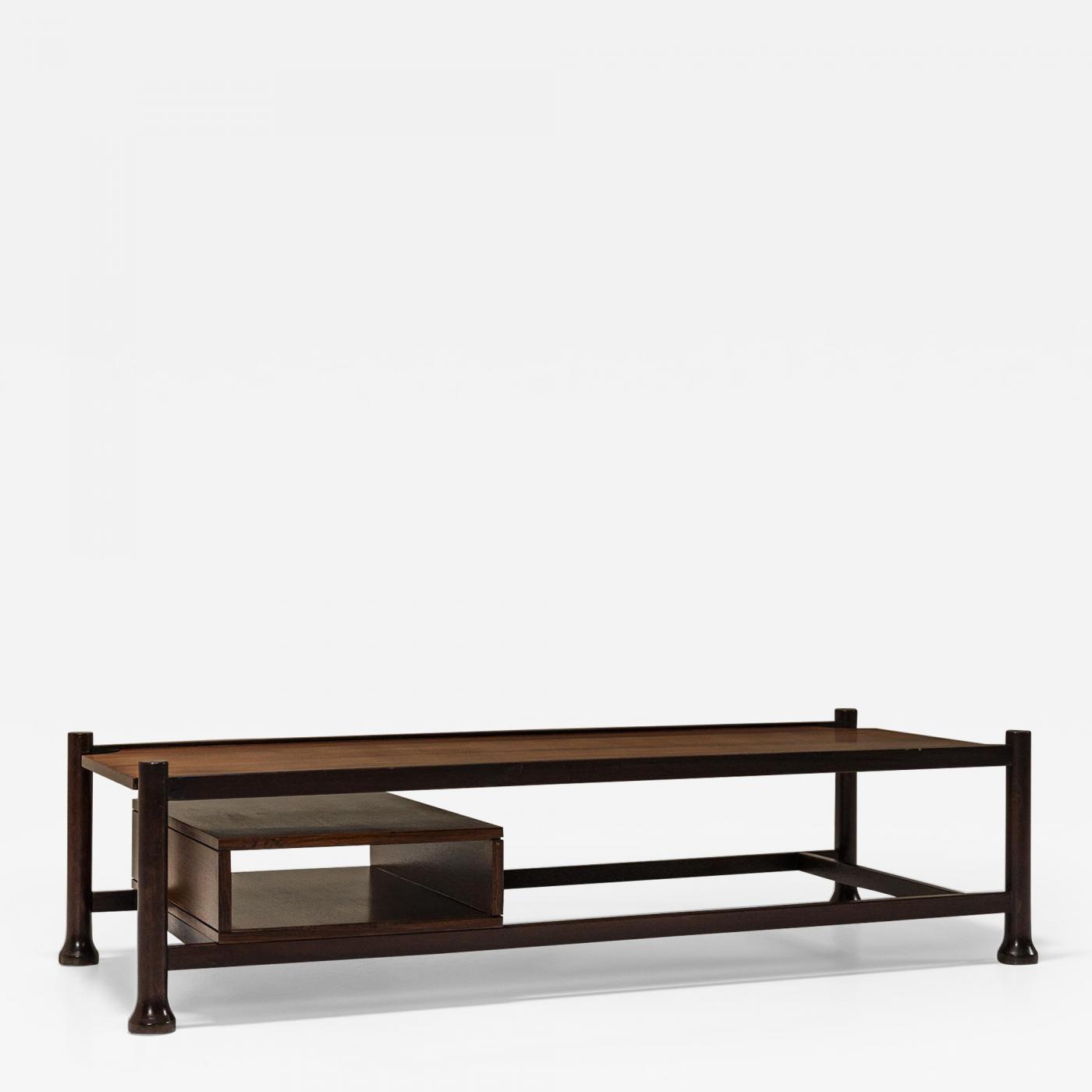 Rectangular coffee table veneered in rosewood.At the first glance we see a lightness created by the clean lines of the frame. And the elongated rectangular shape creates an elegance as we know and maybe expect from Italian vintage furniture from the sixties.It is a no-nonsense design that looks simple and at the same time is made with an eye for detail. The four cylindrical legs are wider at the base and then become slimmer upwards. About a quarter of the way down the leg, the lower beams of the frame, which seem to float just above the floor, are anchored. An accompanying storage compartment is placed on top of the beams and is open on both sides. The top leaf shows a powerful appearance due to the rosewood veneer showing a calm drawing with a warm glow. Corners of the top have a notch that follows the shape of the leg, allowing a small view through. It all adds to the airy elegance of this item.The condition is good with slight discolouration on the surface and small scratches on the frame. Nothing out of the ordinary for a beautiful object of this age.