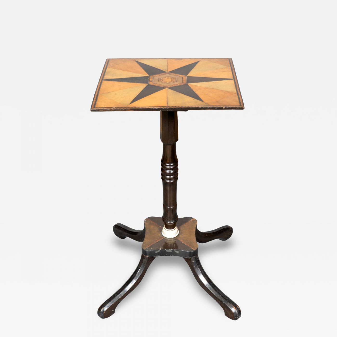 Square top with compass inlay of various woods. Ebonized support and four ebonized legs. Possibly Anglo Indian. An unusual and interesting table.