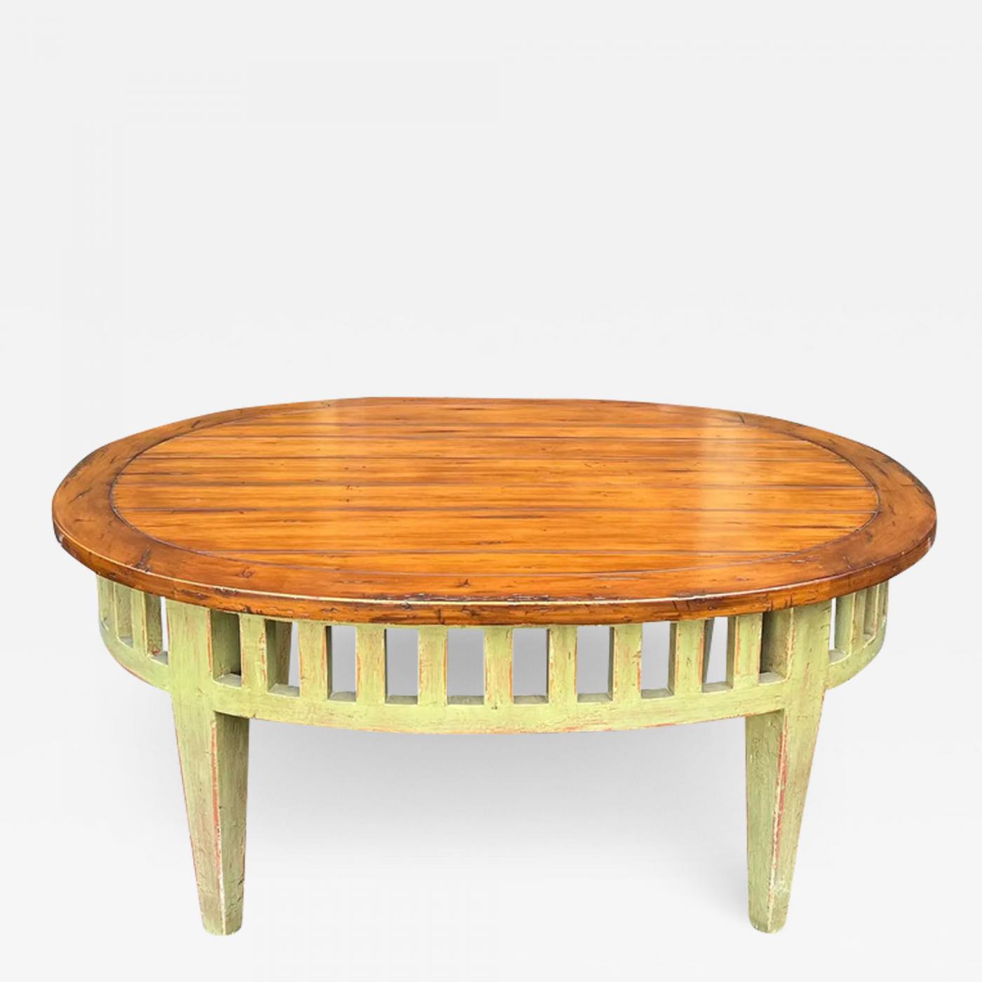 Richard Mulligan American Country Coffee Table. It features a distressed green painted decorated fretwork bae and beautifully worn fruitwood top.
