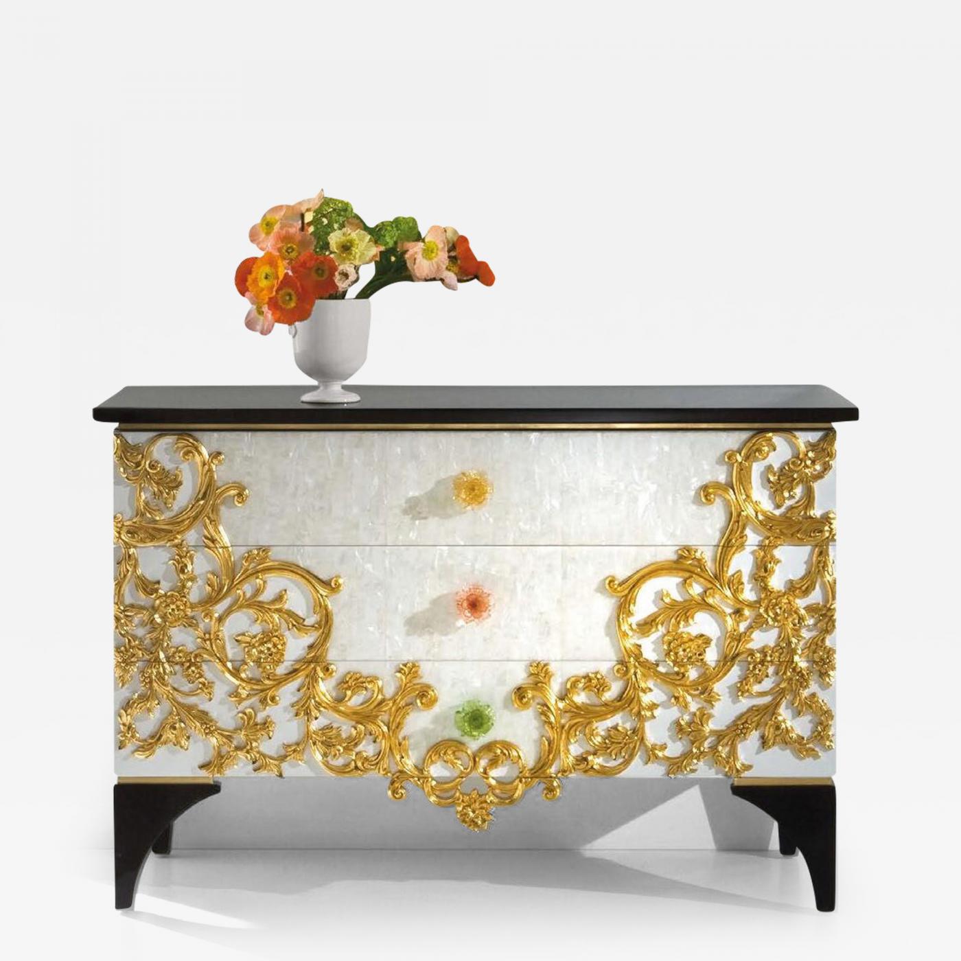 Chest of drawers, top and legs in ebony, drawers in mother of pearl and carved wood in gold leaf, flower knobs Murano glass.