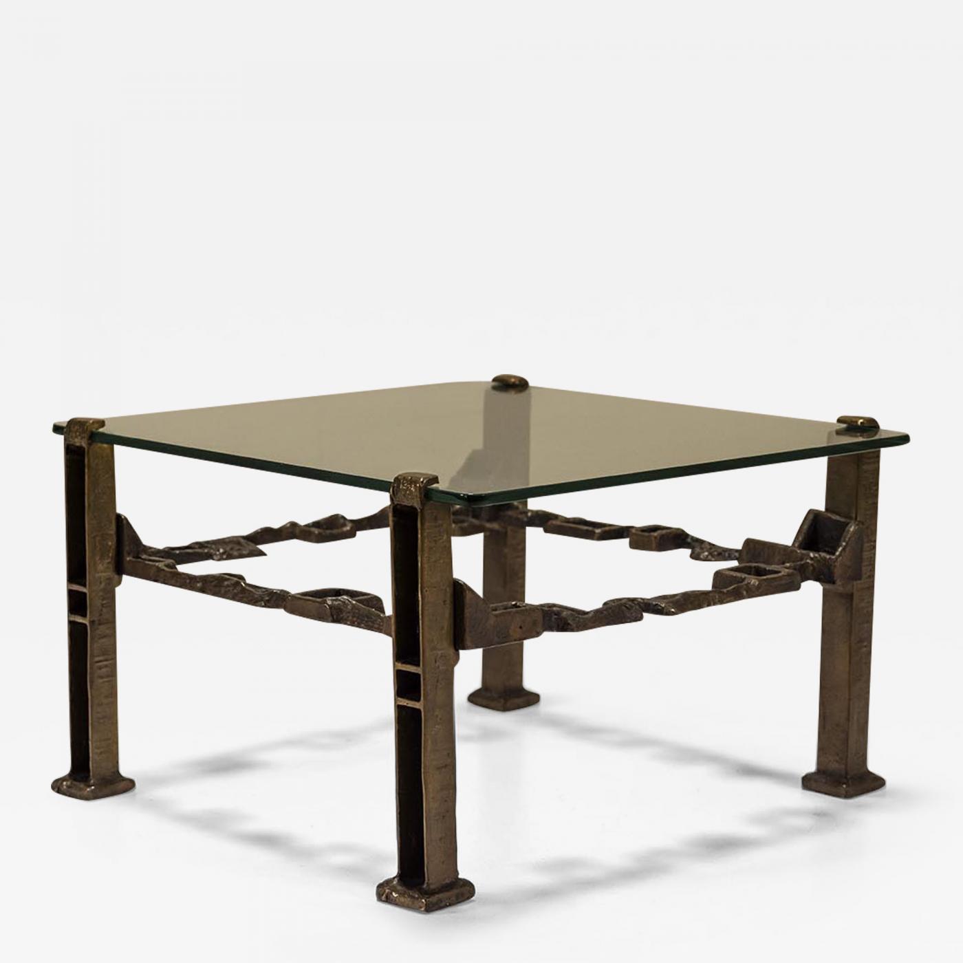 Cast brass is a robust material with a coarse texture and yet its aesthetic effect can exude a degree of elegance. That is the case with this coffee table, which remains a bit enigmatic if we want to determine its style.DesignThe base consists of four legs that can be unscrewed from the decoration that is located at three-quarter height. At the top of the legs there are clamps that secure the rectangular glass plate. Over the years, the base has acquired a beautiful patina that gives a beautiful reflection when the light falls on it.In terms of style, the pattern of uneven rectangles that connect the legs together like a chain is reminiscent of Nerone-style objects from the 1960s. Albeit in a slimmed down form. ConditionThe condition is very good with minimal traces of use.