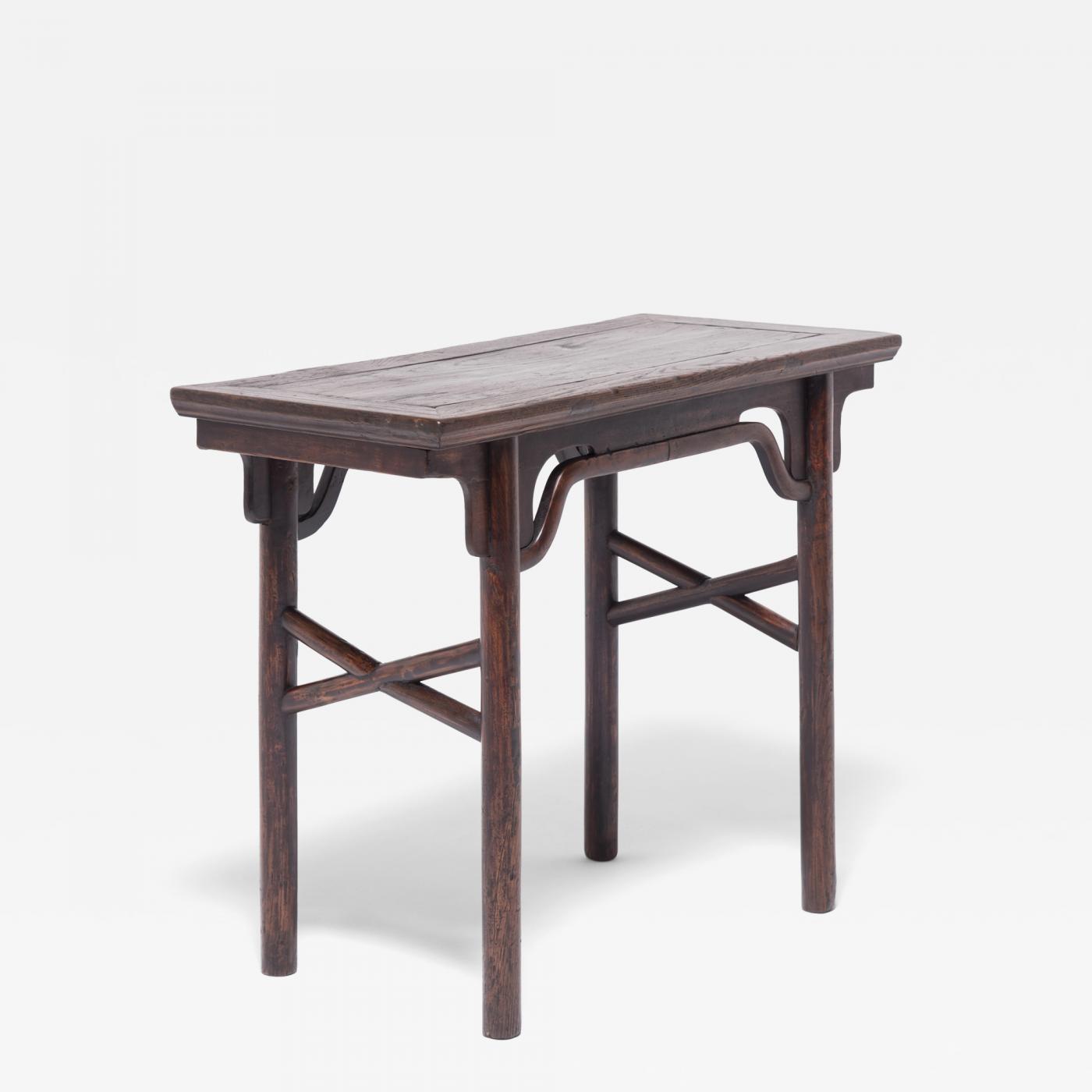 Depth: 18.75" // Crossed stretcher bars and apron curves animate the square profile of this elmwood table. Made in Hebei province around 1850, the beautifully preserved table was used for sharing wine and spirits. Imbibers would gather around the table and engage in a group toast, finishing their drinks in one gulp. We love how its unusual and intoxicating lines energize a room.