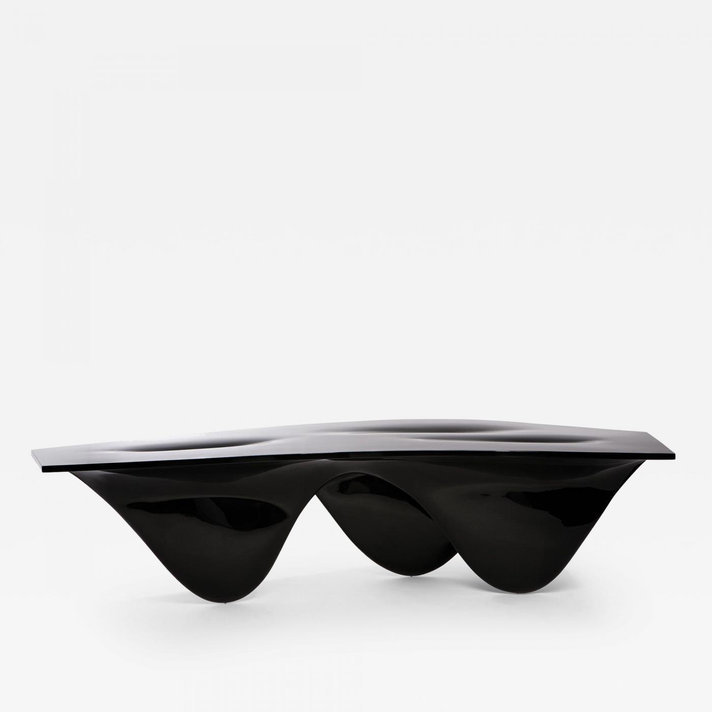 The voluptuous Aqua Table is an uninterrupted whole, a curious and curvaceous form that invites viewers to engage with it. Standing as an impressive centrepiece it delivers a stylish focal point. The three fin-like legs of the Aqua Table appear to be in motion and register as gradients on the gently undulating tabletop. Eight coats of high-gloss automotive paint are applied and polished by hand to make a striking surface capable of reflecting light in flowing pools and waves.