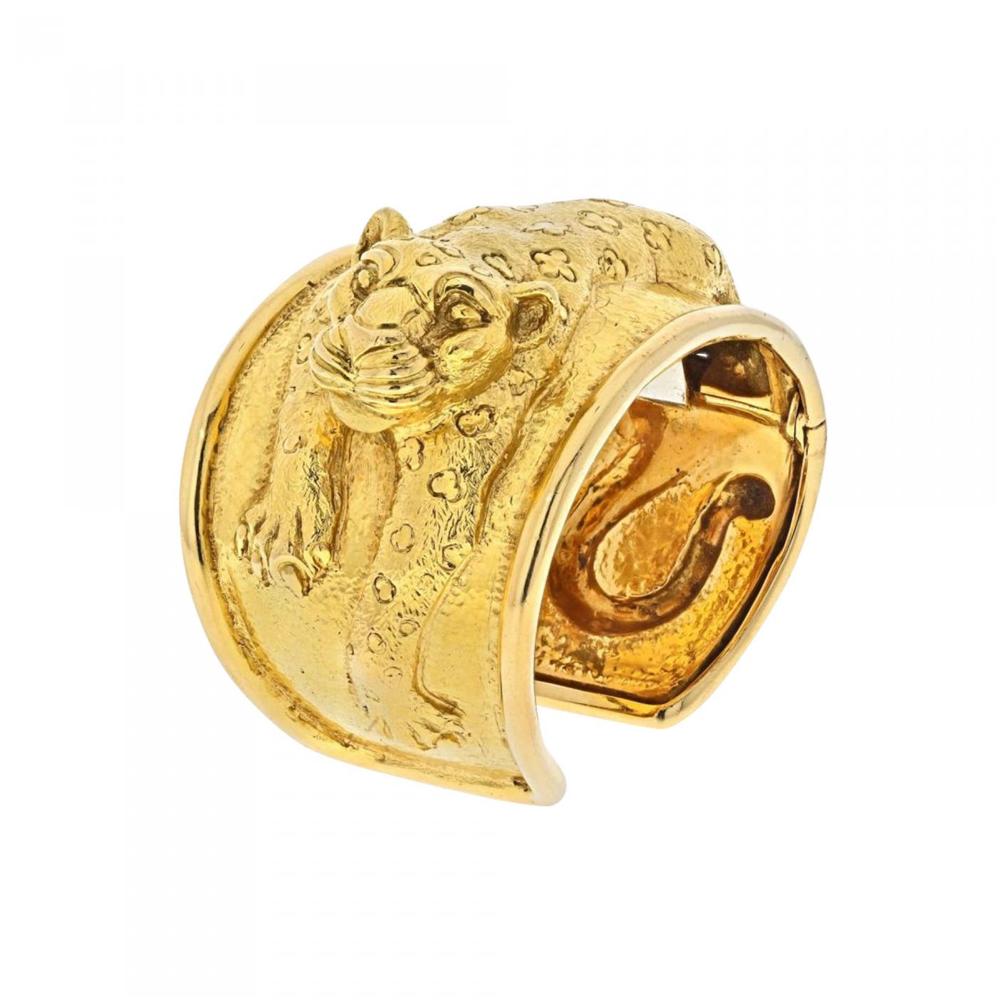 Vintage 18K Yellow gold Leopard cuff by David Webb. The cuff has a repousse Leopard head and body.