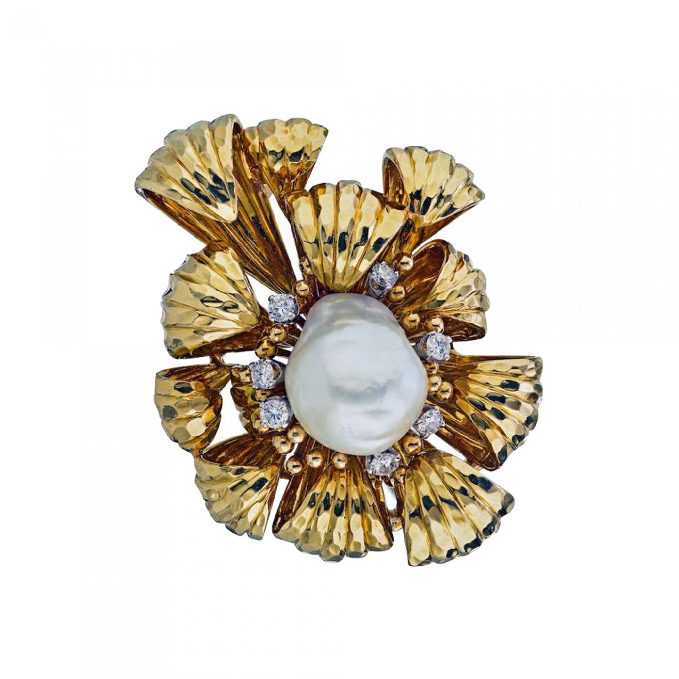 Centering a baroque pearl surrounded by stylized gold leaves set with round diamonds weighing approximately 0.35cts carats signed Webb.