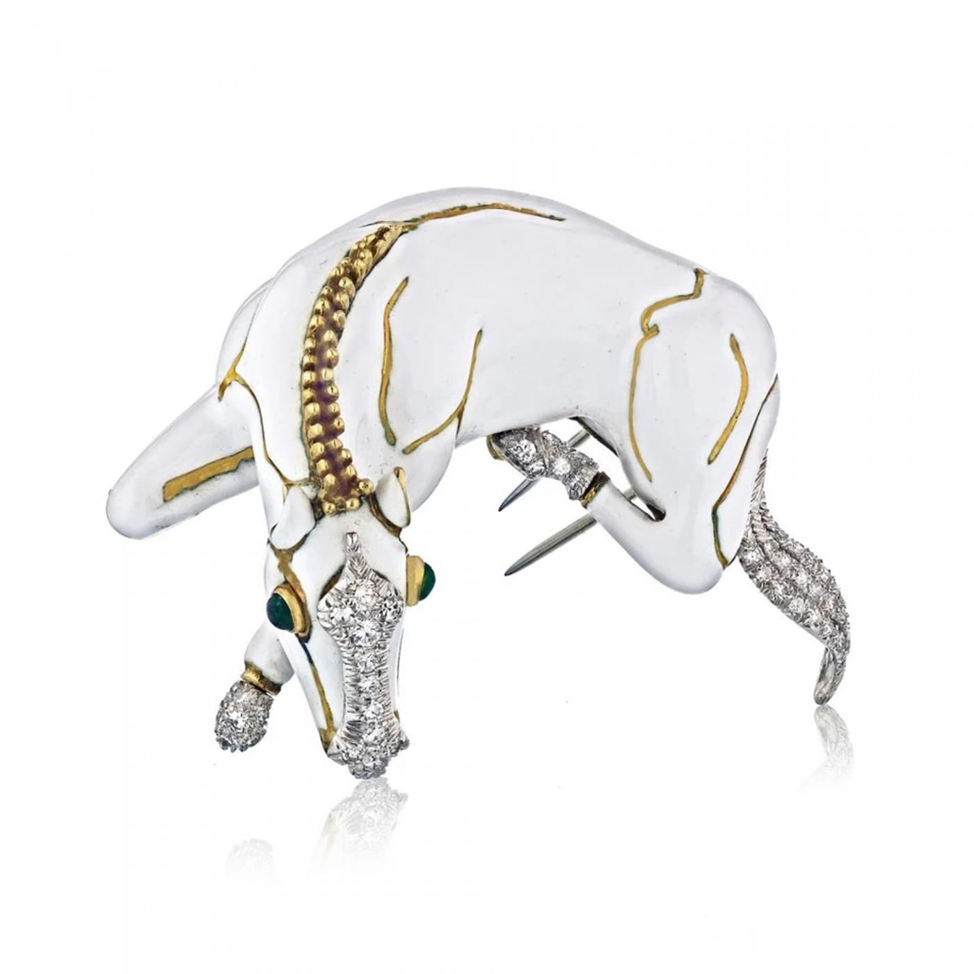 DAVID WEBB HORSE PLATINUM & 18K YELLOW GOLD WHITE ENAMEL DIAMOND BROOCH